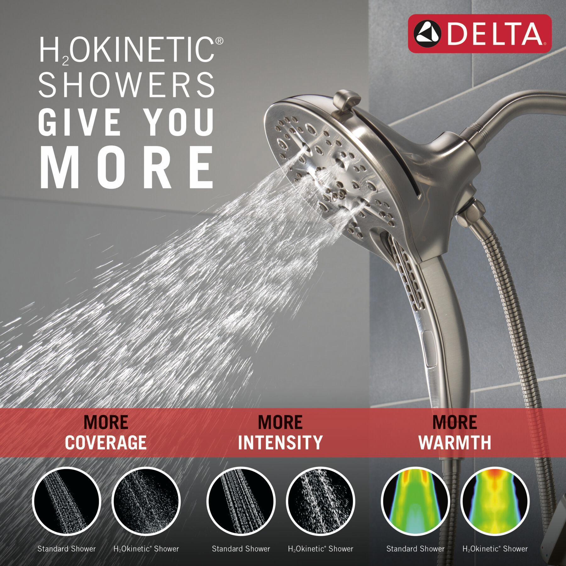 - H2Okinetic® Technology showers feel like more water and more pressure, with more coverage