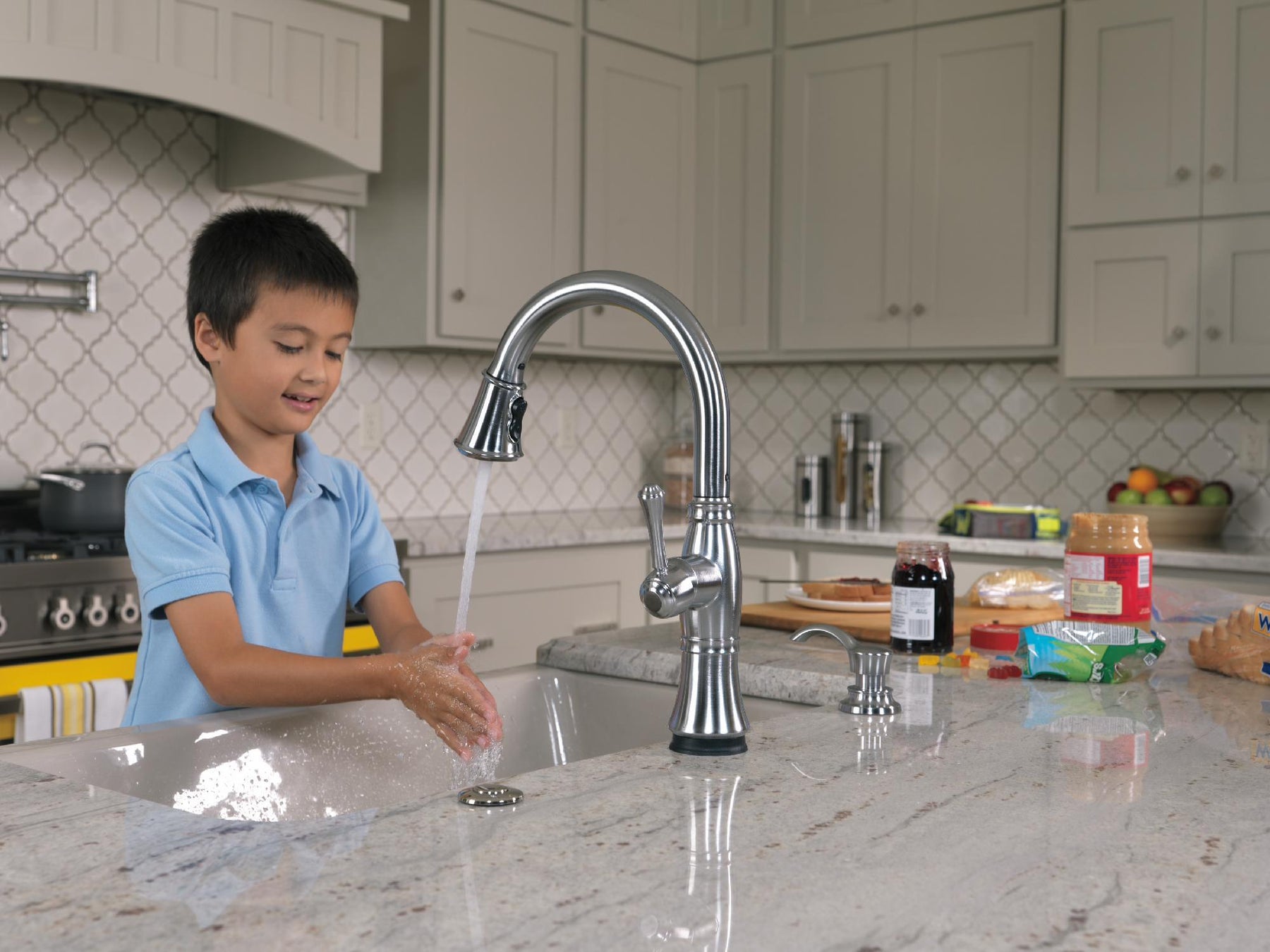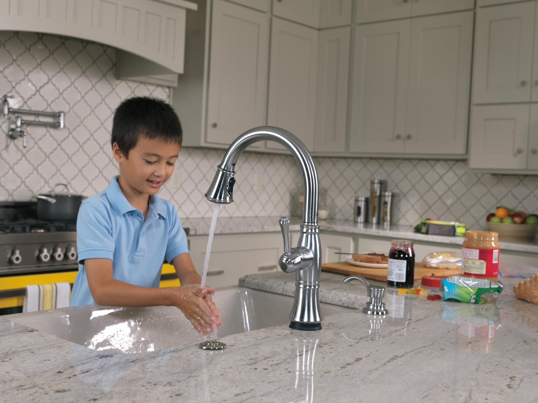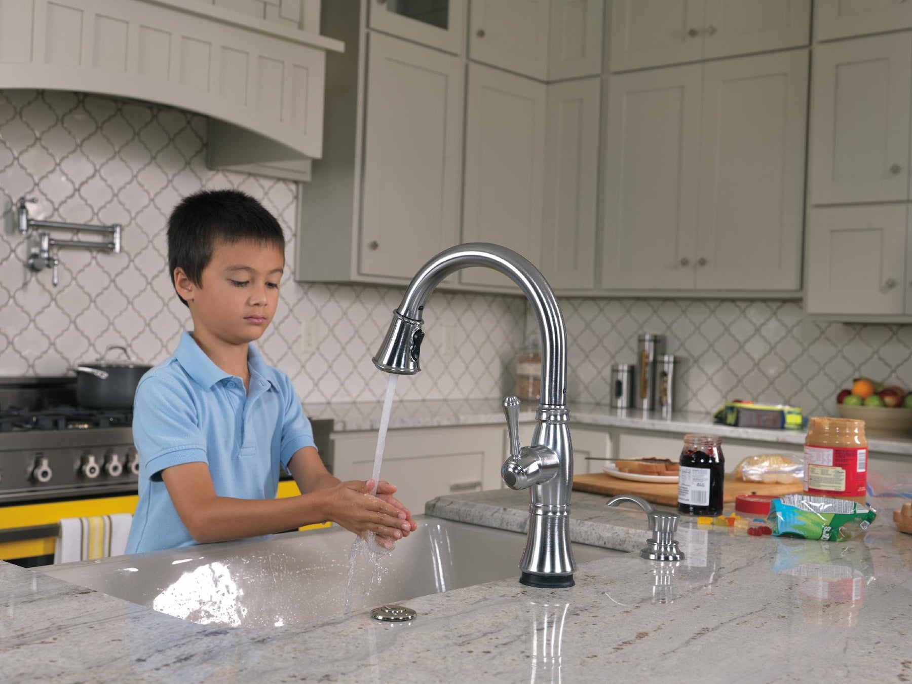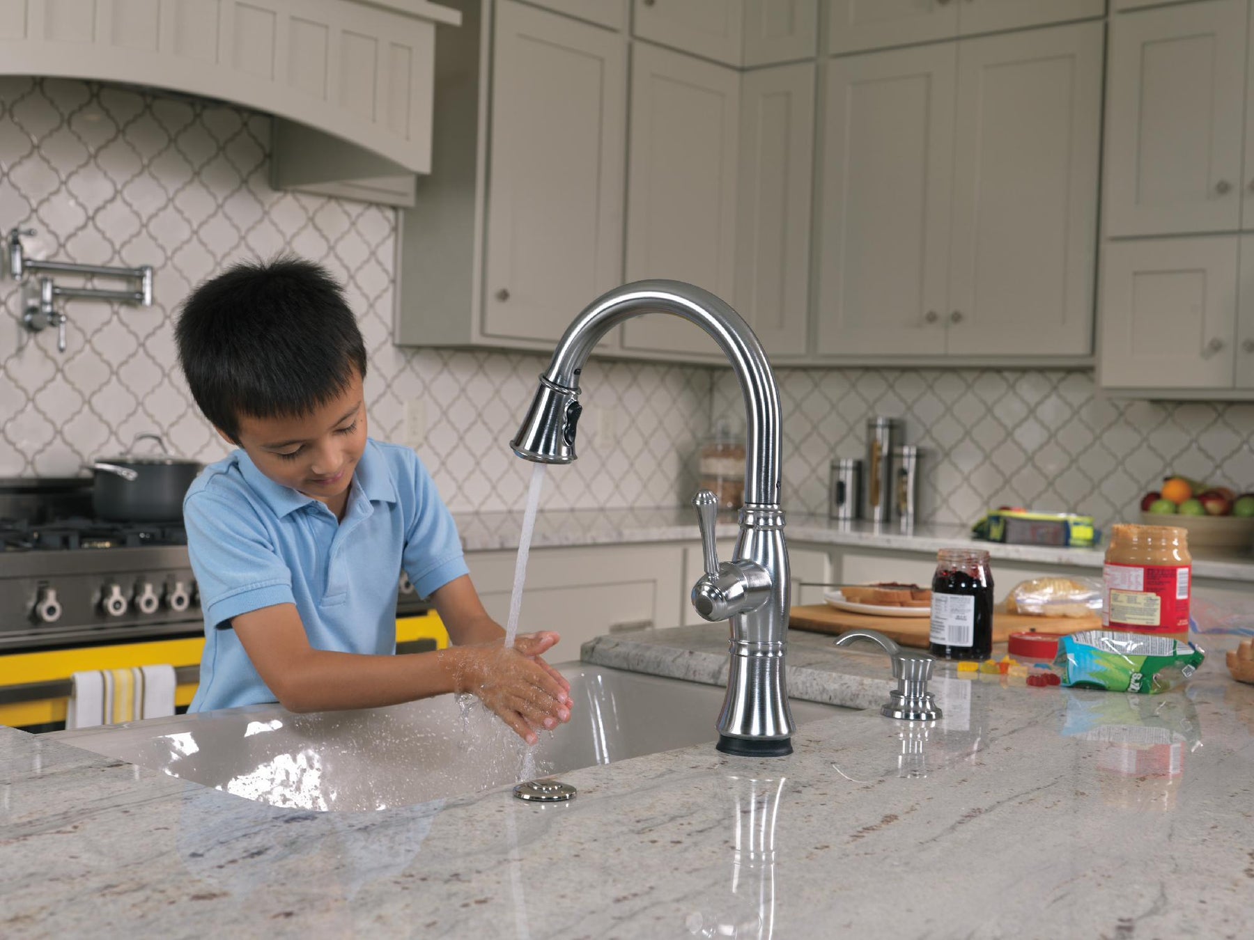 - Dual shut off on the Delta Pot Filler faucet allows the user to turn the water off at either the wall or the spout, controlling the water flow at the point of use