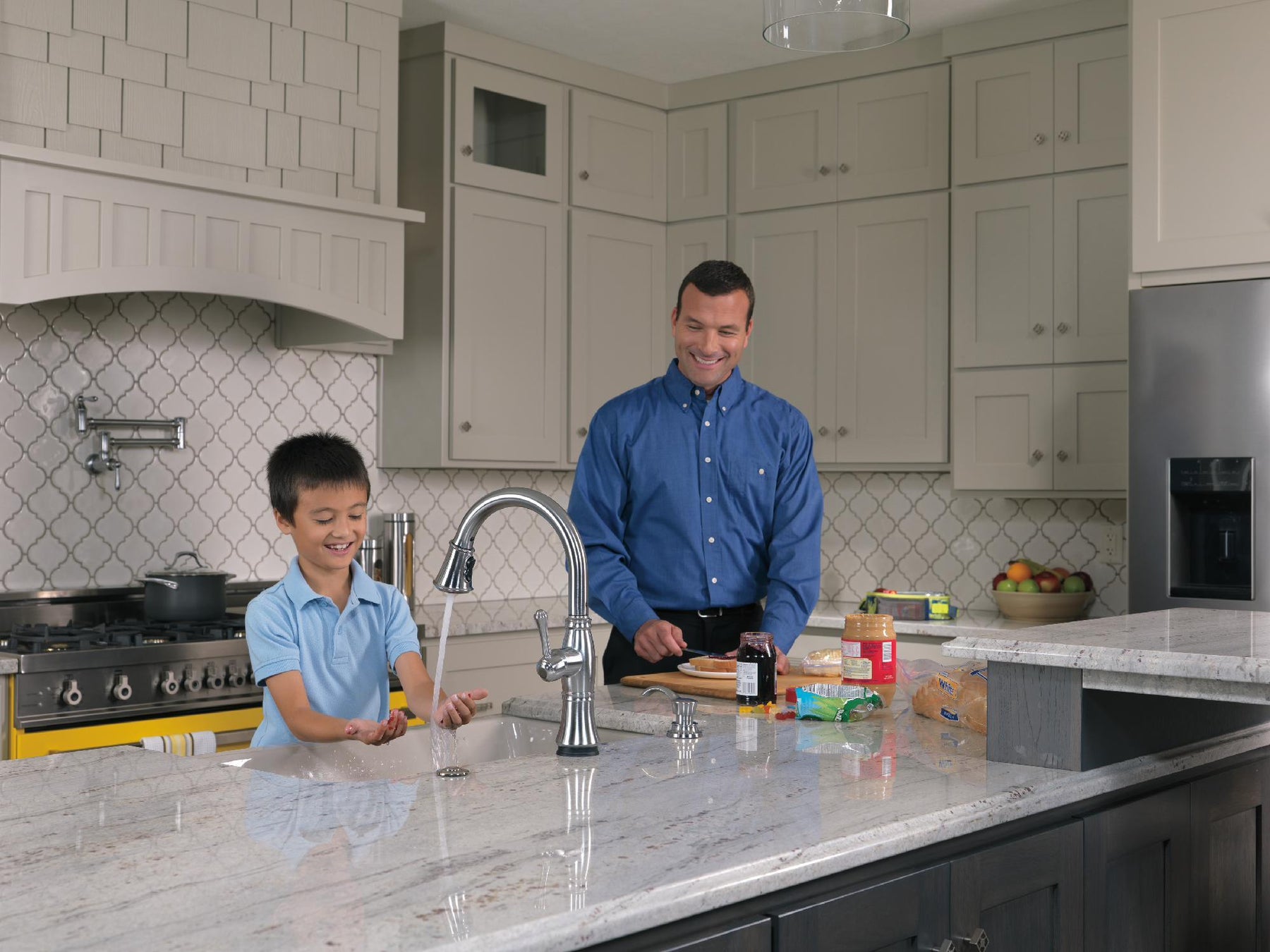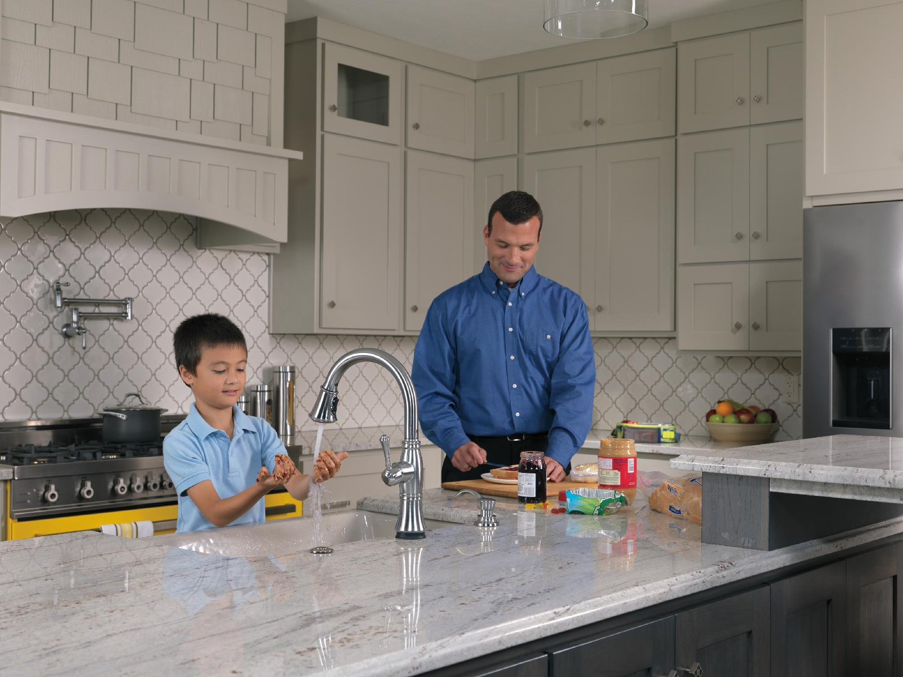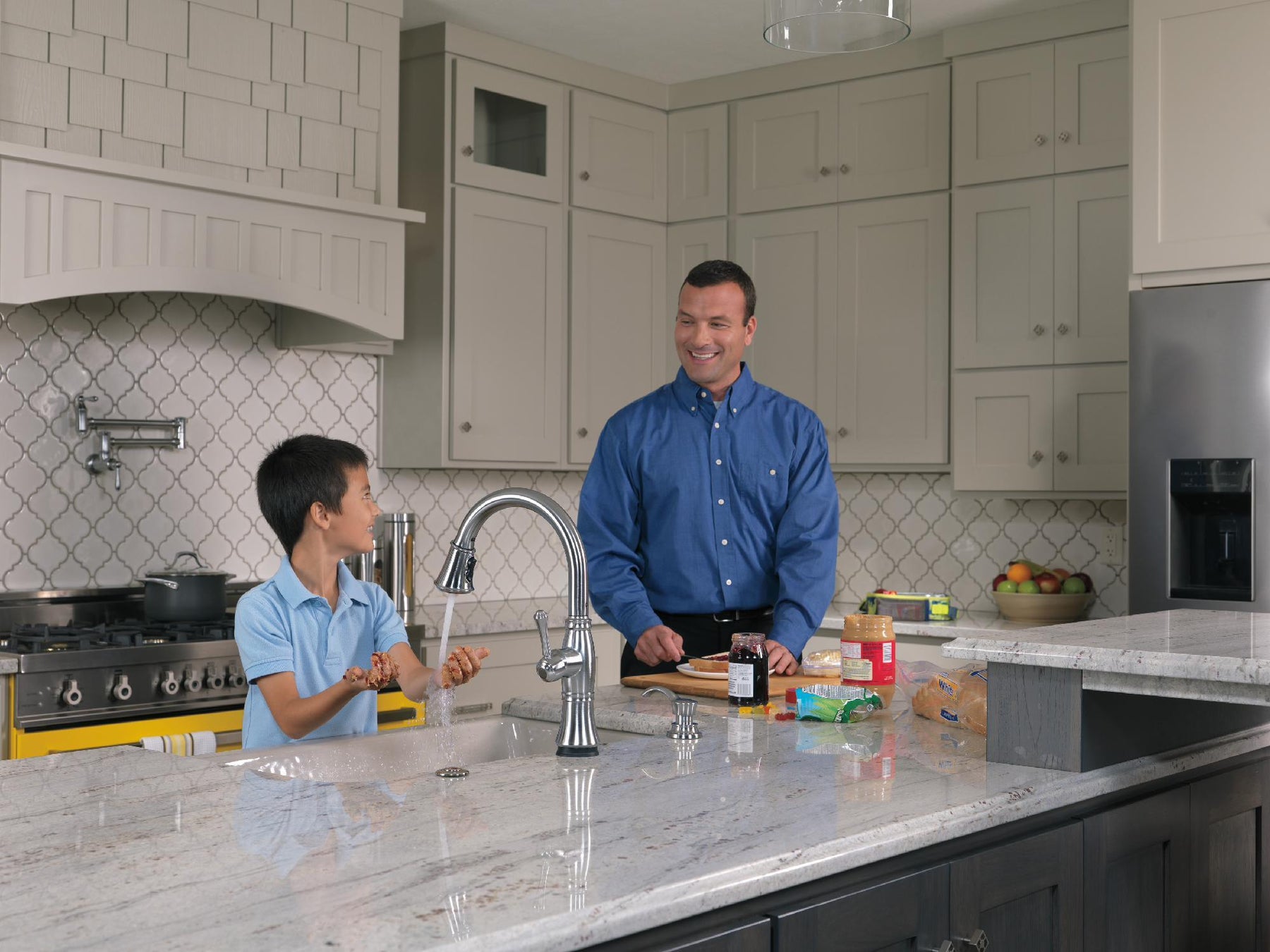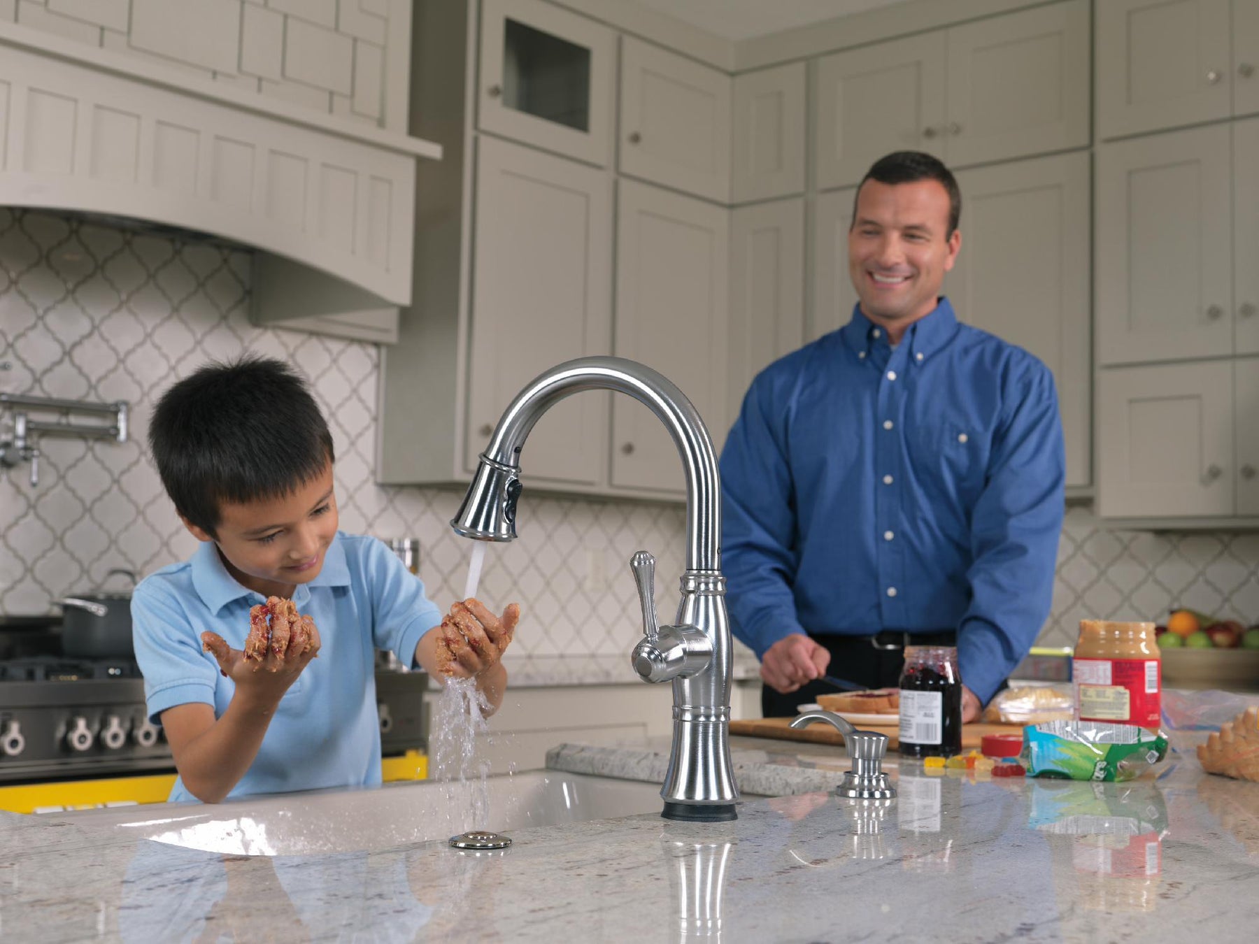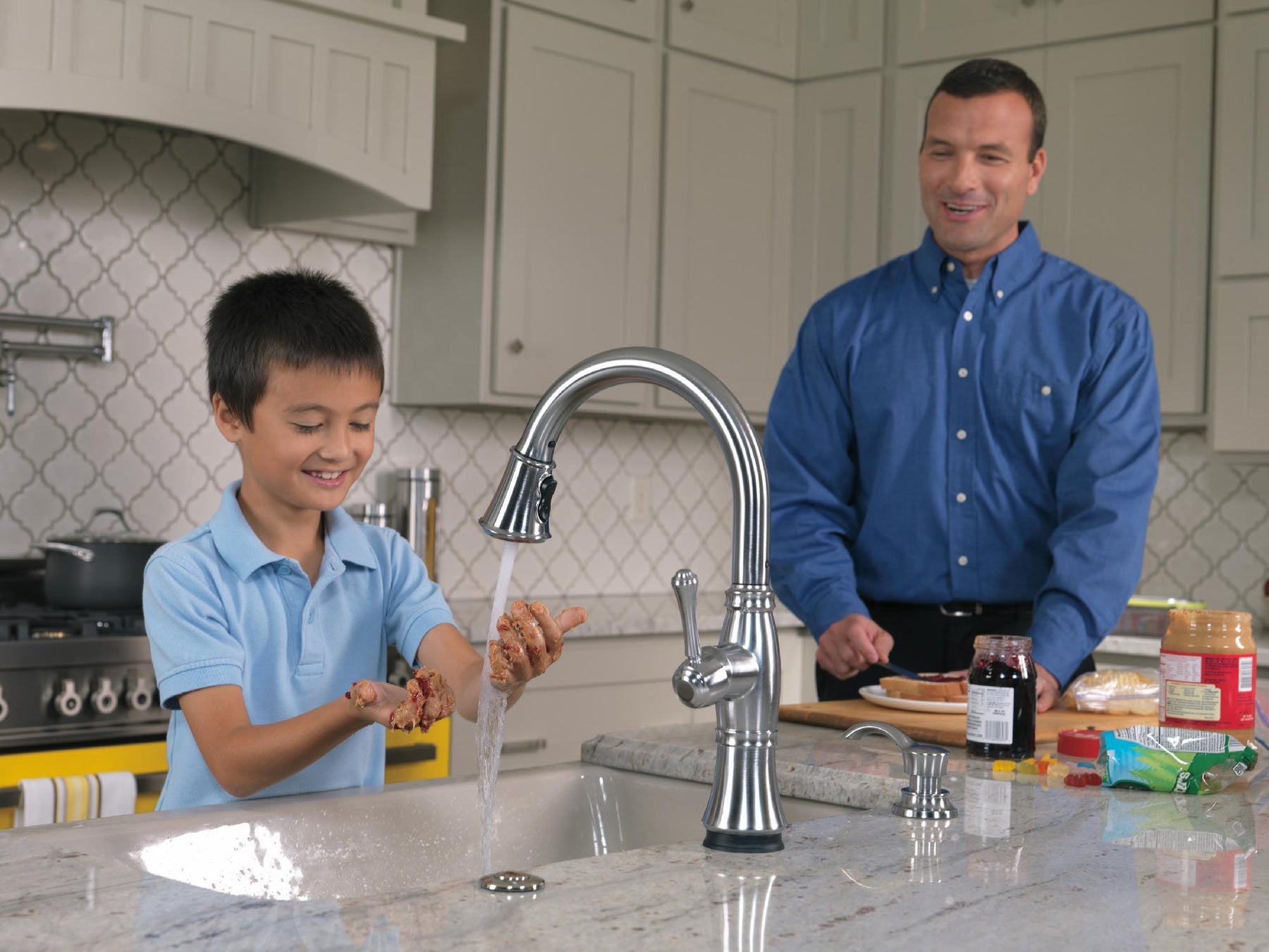- Dual shut off on the Delta Pot Filler faucet allows the user to turn the water off at either the wall or the spout, controlling the water flow at the point of use