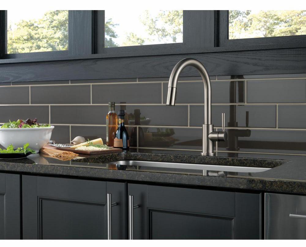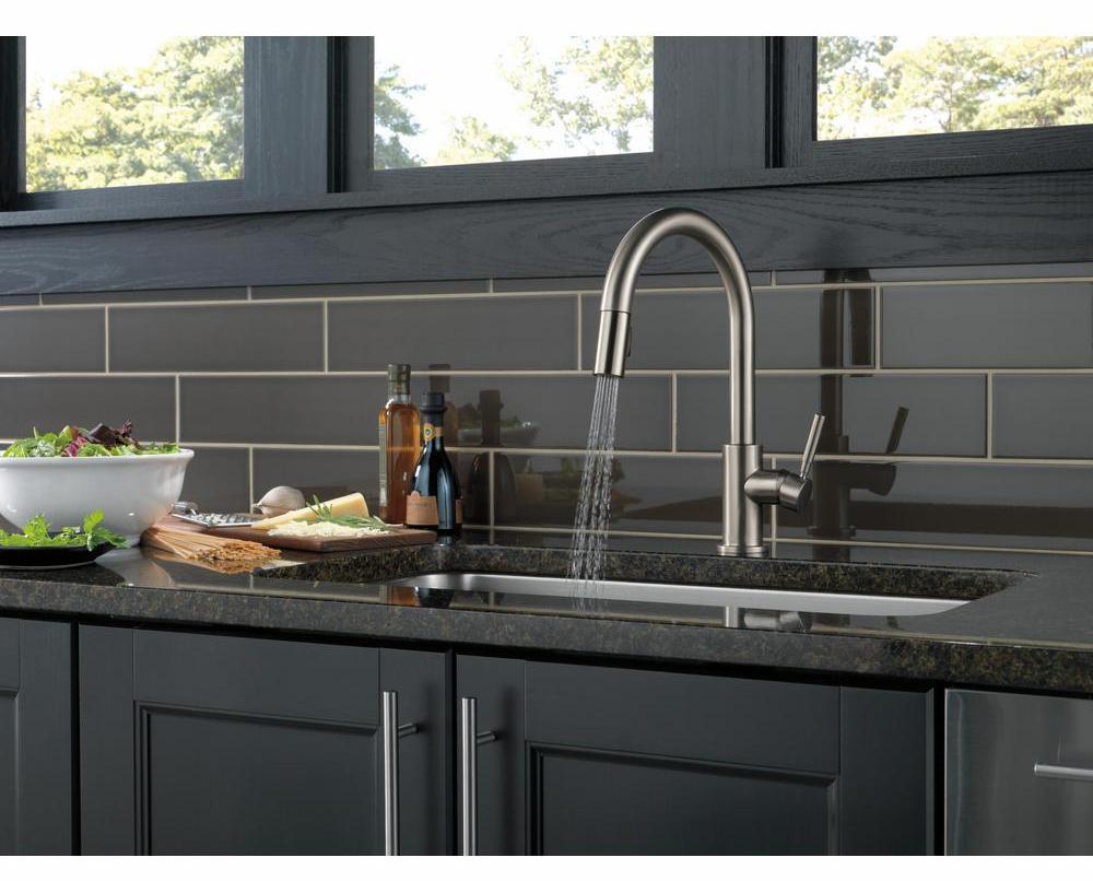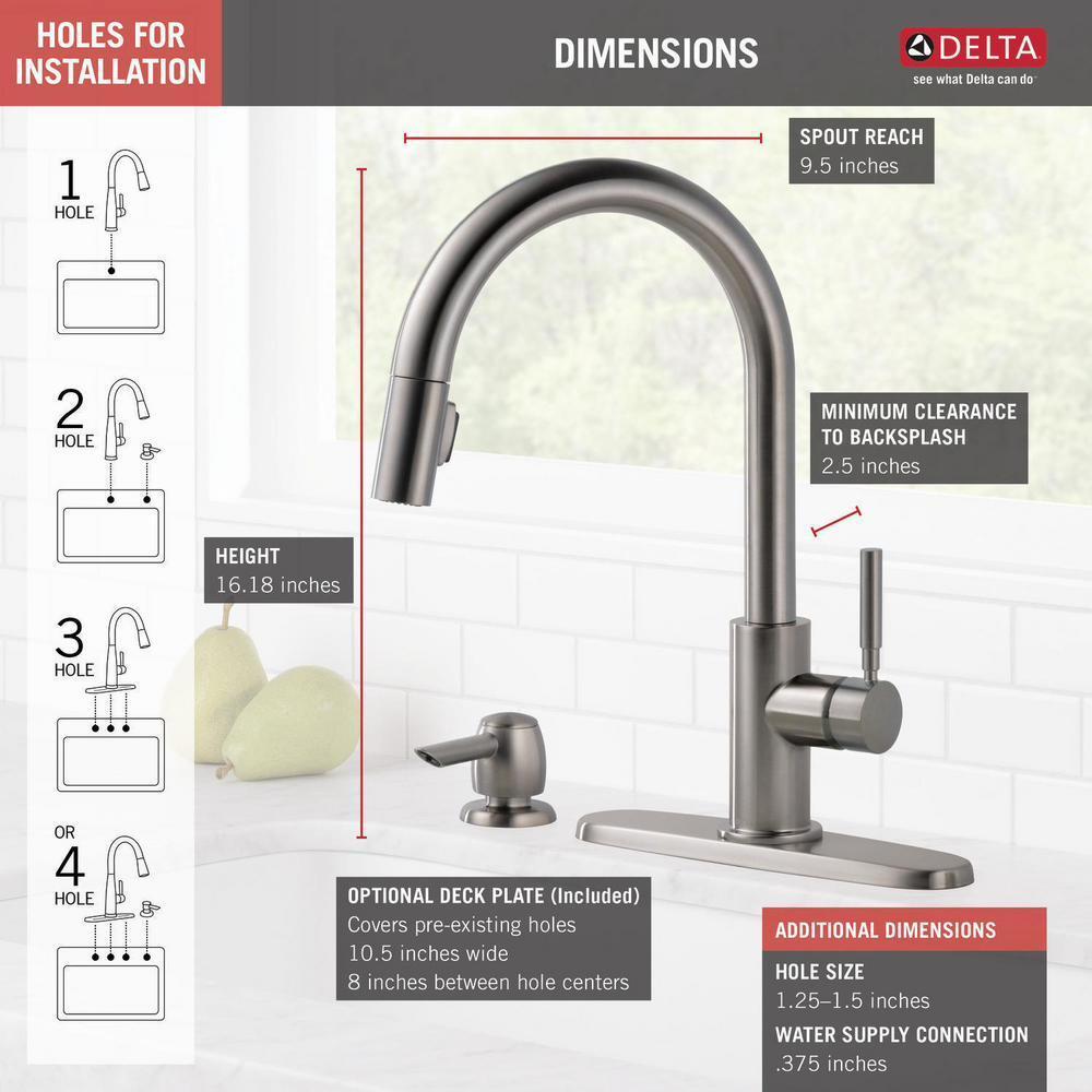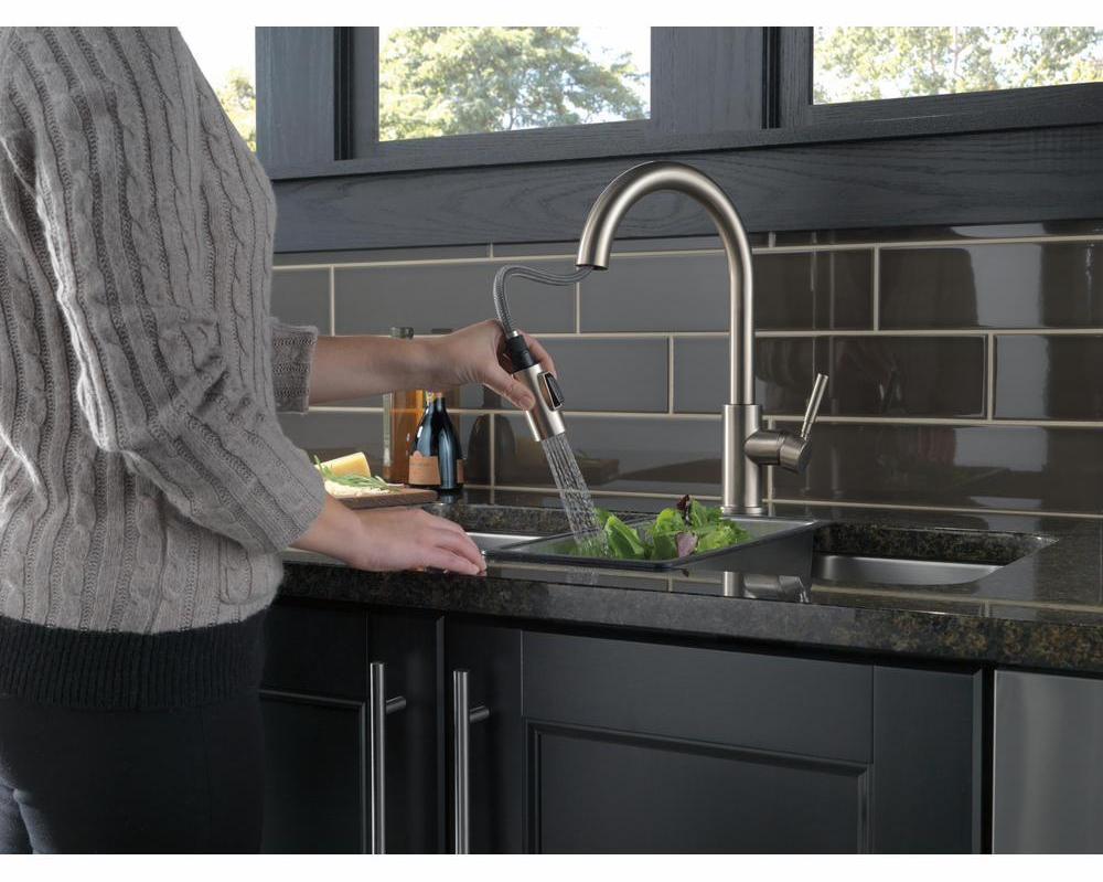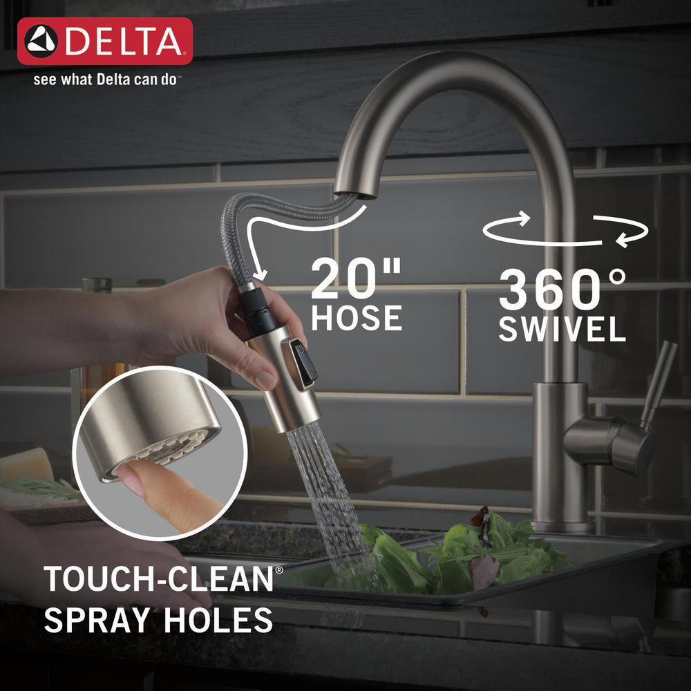 The pull-down spray wand comes free with a gentle tug and gives you total flexibility. The hose extends and retracts without friction points, fed by gravity. As you raise the wand to dock it, the magnet embedded in the spout pulls the wand precisely into place. So, unlike other pull-downs that tend to droop over time, MagnaTite keeps your pull-down faucet looking picture-perfect. SpotShield Technology means less spots, less cleaning, and antimicrobial protection of the finish. Delta's exclusive DIAMOND Seal Technology uses a valve with a tough diamond coating. InnoFlex PEX waterways keep water inside the faucet out of contact with potential metal contaminants. This powerful combination brings you a faucet built to last up to five million uses. Only Delta faucets are equipped with Touch-Clean soft, rubber nubbins that allow you to easily wipe away calcium and lime build-up with the touch of a finger.