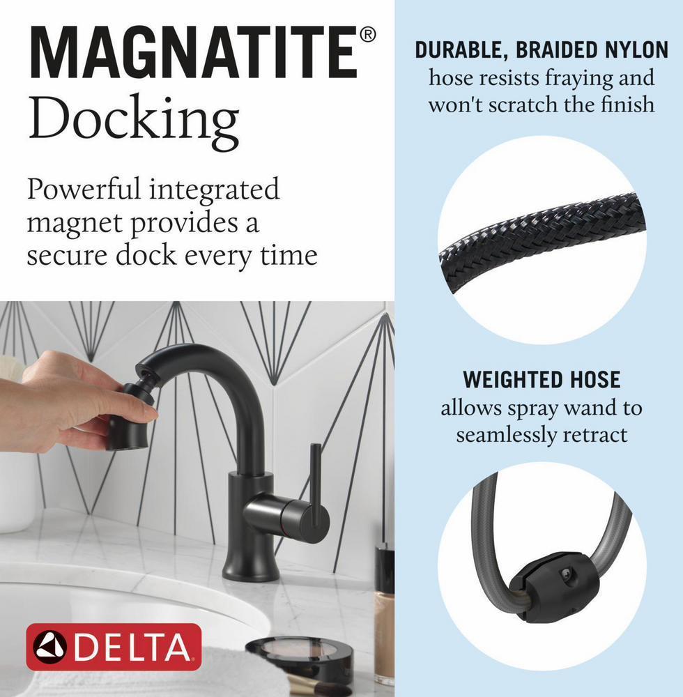 - MagnaTite® Docking uses a powerful integrated magnet to snap your faucet spray wand precisely into place keeping it docked when not in use