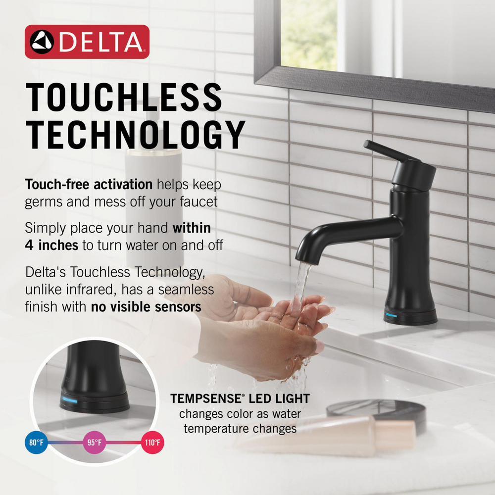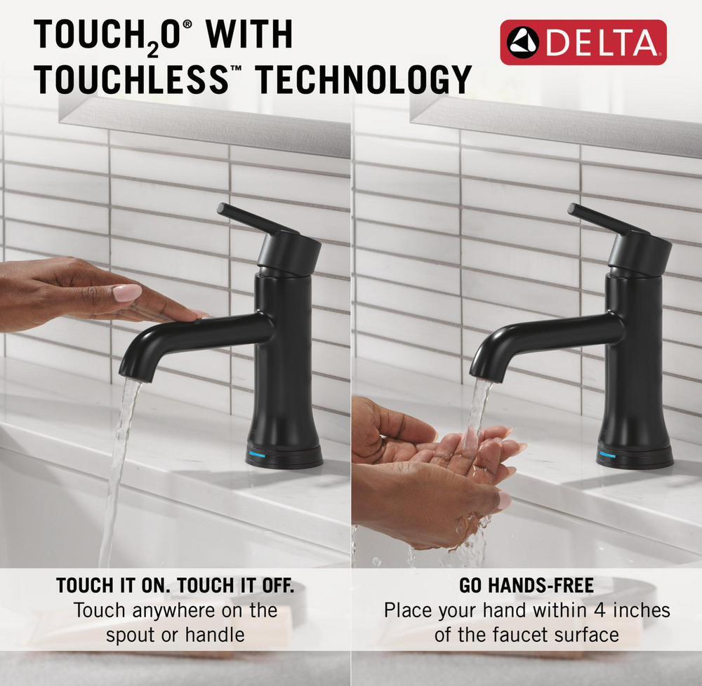 Inspired by the sleek elegance of modern European design, the Trinsic Bath Collection completes the look of any contemporary bath, from classic to rustic. Touch it on. Touch it off. Or go completely hands-free. Delta Touch2O with Touchless Technology helps keep your bathroom clean by giving you three ways to operate your faucet: manually with the handle, with a simple touch anywhere on the spout or handle, or by placing your hands near the faucet. The high-tech capacitance sensing capabilities of Touchless faucets allow the flow of water to be activated by breaking the capacitance field anywhere around the device, unlike traditional hands-free infrared sensors which require your hands be in a particular place and are sensitive to lighting conditions and clothing and skin color. You can install with confidence, knowing that Delta faucets are backed by our Lifetime Limited Warranty.