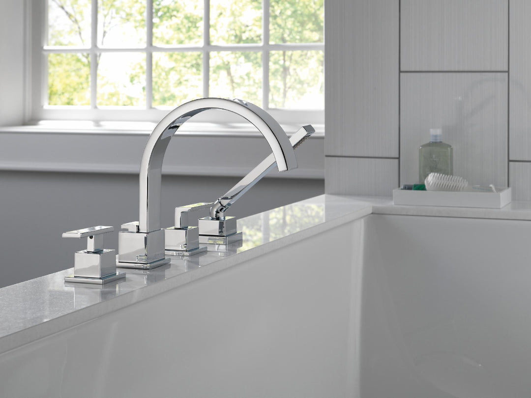 Complete your bath with a beautifully designed Delta roman tub faucet, meticulously crafted to turn heads and enhance your experience. The included hand shower makes this a versatile addition to your bath, perfect for rinsing off, washing loved ones and pets or keeping your tub clean. Chrome has rapidly become one of the most popular finishes across décor styles in the bath thanks to its stunning gloss and innate versatility. Paired with crisp lines and bright whites, it creates a bold, modern contrast, but it works equally well with vintage styles and traditional spaces to convey a hint of nostalgia. You can install with confidence, knowing that Delta faucets are backed by our Lifetime Limited Warranty.