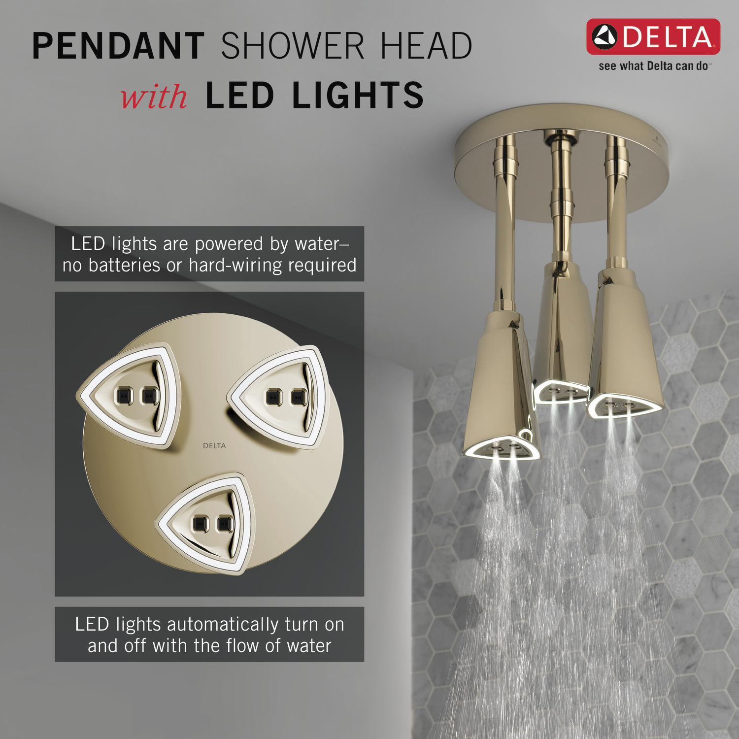 The centerpiece of any shower, Delta LED Pendant Raincan Shower Heads establish distinctive appeal in your space, blending cultivated designs with modern technologies. The tranquil illumination of the water-powered LED accent lights combines with H2Okinetic Technology for a soothing experience that transports you from shower to spa. The LED lights automatically turn on when water is running and turn off when water flow stops. The accent lights emit a subtle glow to provide soothing ambience, as opposed to serving as a bright, primary light source. Delta H2Okinetic Showers look different because they are different. Using advanced technology, H2Okinetic showers sculpt water into a unique pattern, giving you 3X the coverage of a standard shower head.* The end result is a shower that provides more coverage, more warmth and more intensity for a truly drenching shower experience. So go ahead and indulge, because now you can enjoy the feeling of more water without using more water. *Coverage measured in accordance with EPA WaterSense Specification for shower heads, March 4, 2010.