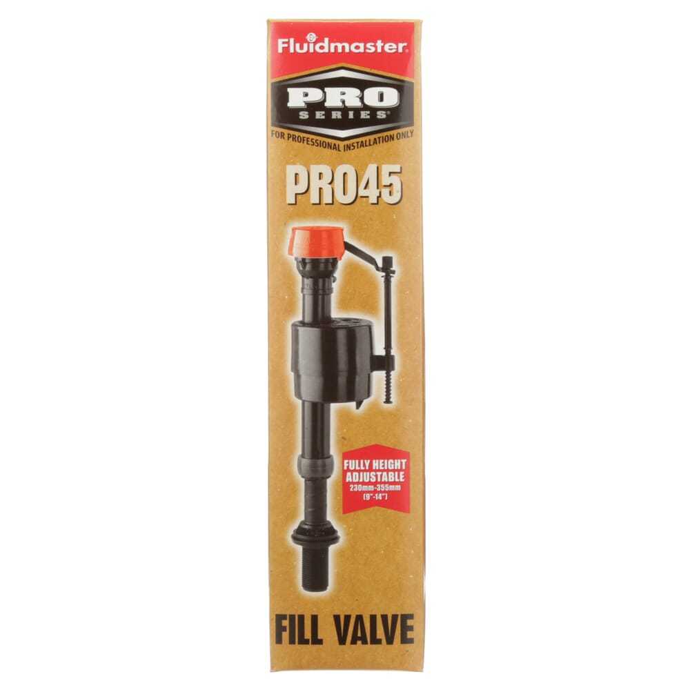 The Fluidmaster PRO45 Fill Valve has a special design and shank that makes it the quietest toilet fill valve on the market, reducing water hammer to almost nothing. Your customers will barely notice their toilet refilling. This versatile design is fully height adjustable between 9" - 14" and fits all brands. Easy to install and featuring a 5 year warranty. Found only where PRO Series is sold.