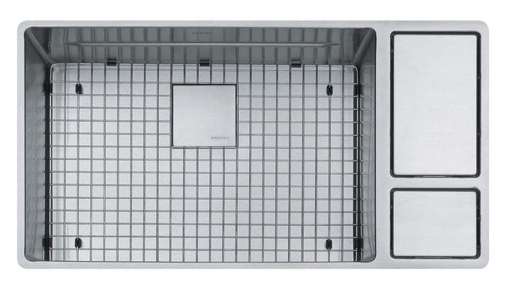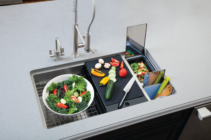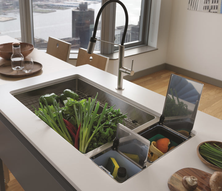 Stainless steel undermount single bowl kitchen sink with integrated waste and compost buckets, and sink accessories. Includes drain tray, colander, shelf/bottom grid, cutting board and mat, roller mat, waste fitting, and drain cover.