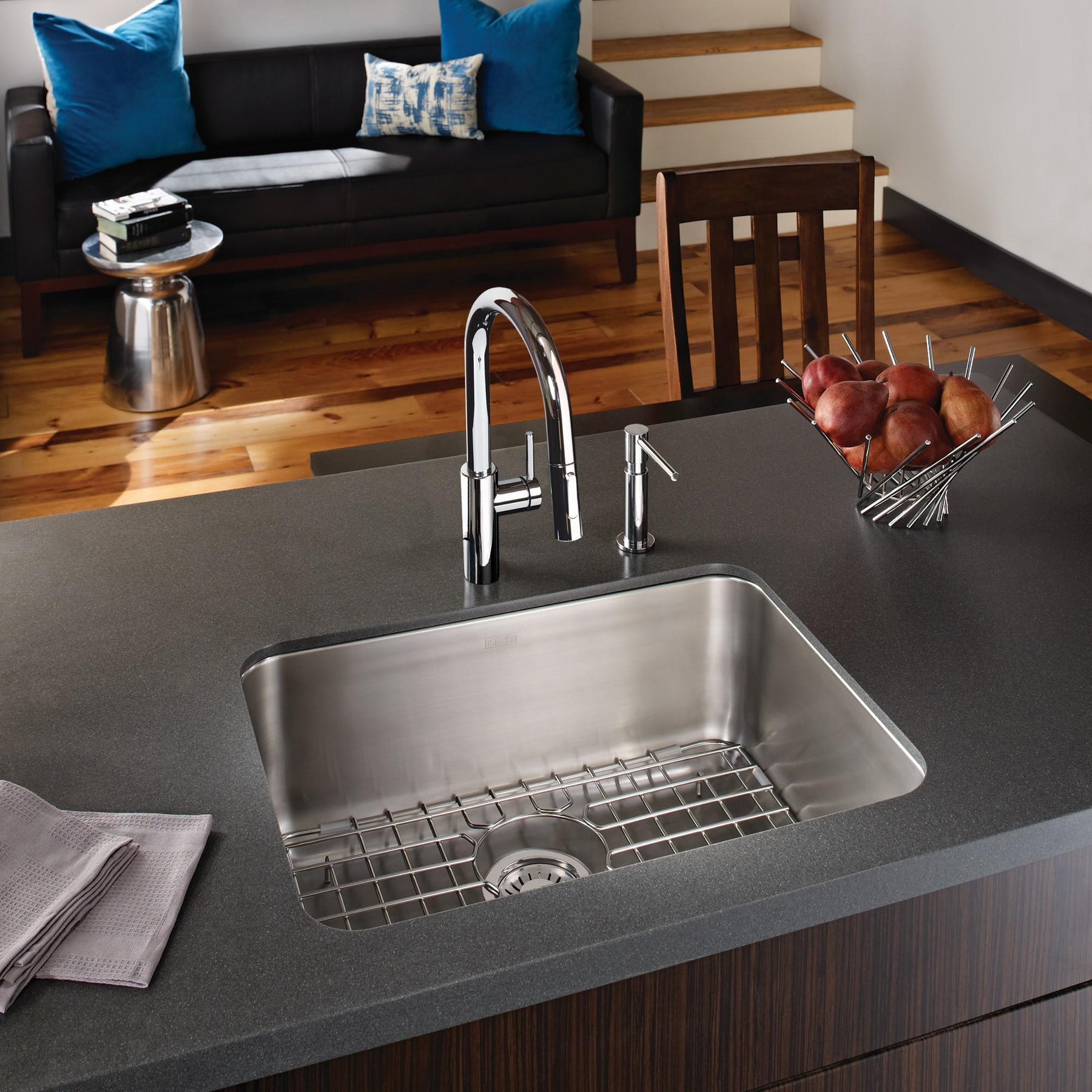 24.75-in. x 18.7-in. 18 Gauge Stainless Steel Undermount Single Bowl Kitchen Sink With the simplicity of shape, the functionality of a deep bowl, and the convenience of wide corners for easy cleaning, the Grande series will meet your everyday kitchen needs. Commercial grade 18-gauge stainless steel, heat, and sound insulation to reduce the sound of running water into the bowl and keep the water warmer for longer.