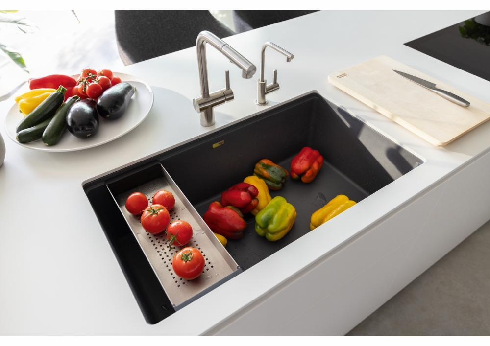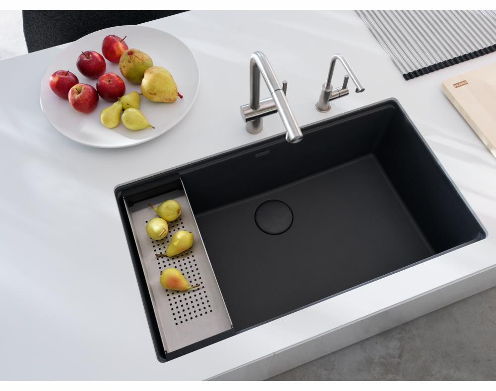 Franke Maris Fragranite sinks are designed to bring order to the chaos of your kitchen so that you can easily cook and clean. The integrated ledge system enhances your workspace by providing a multi-level surface that allows you to work directly over the sink, creating separate areas for food preparation. The smooth finely textured surface naturally hinders bacteria growth without the need for additives. The rear drain maximizes the usable surface of the bowl and creates extra cabinet space beneath the sink. Maris Fragranite sinks are scratch-resistant, fade-resistant, and impact resistant, making them a perfect choice in many environments, especially in busy family homes.