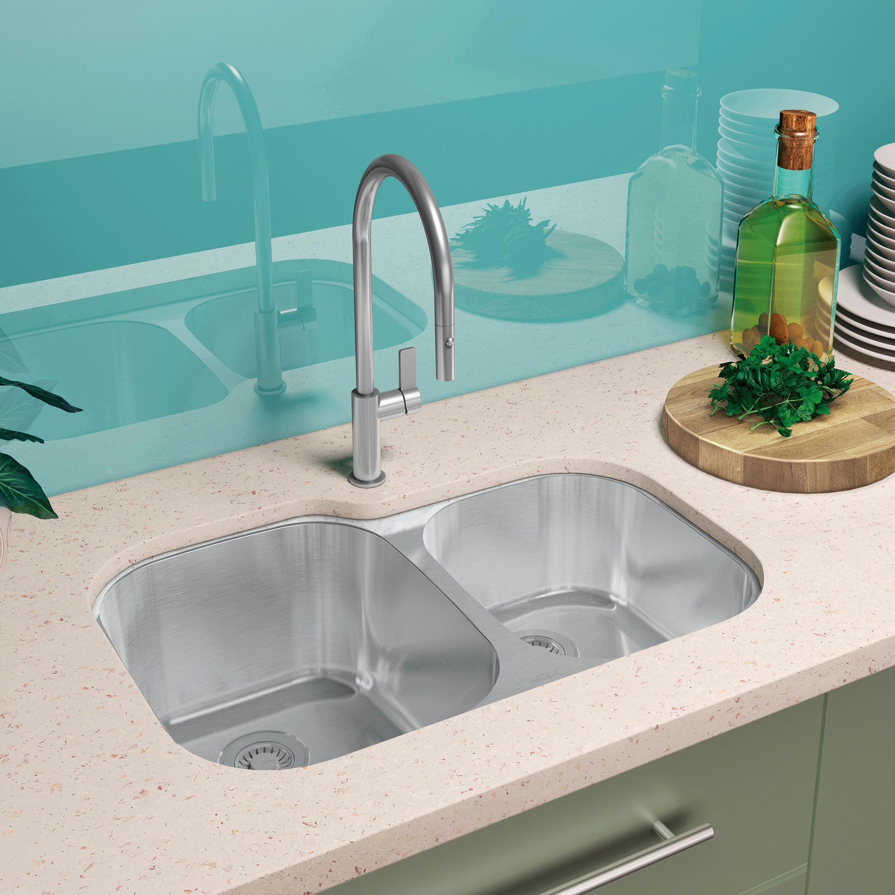 31.5-in. x 20.5-in. 18 Gauge Stainless Steel Double Bowl Kitchen Sink. Large and deep, yet space conscious, this eclectic sinks offers a rear drain to maximize the usable bottom surface of the bowl while also creating extra cabinet space beneath the sink. The multiple bowl sink is designed to handle everyday tasks of even the busiest kitchens. The commercial grade 18-gauge stainless steel and wear-resistant silk finish offer durability, and make them practically maintenance free. Sink strainer assembly included.