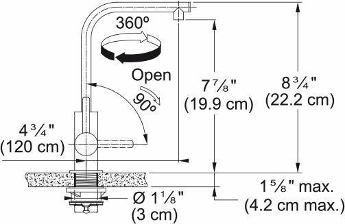 - Overall Dimensions: Faucet Height: 8.75-in, Spout Height: 7.8-in from countertop, Reach 4.7-in; Installation : 1-hole installation 1.3/8-in hole required and is common in most installations.