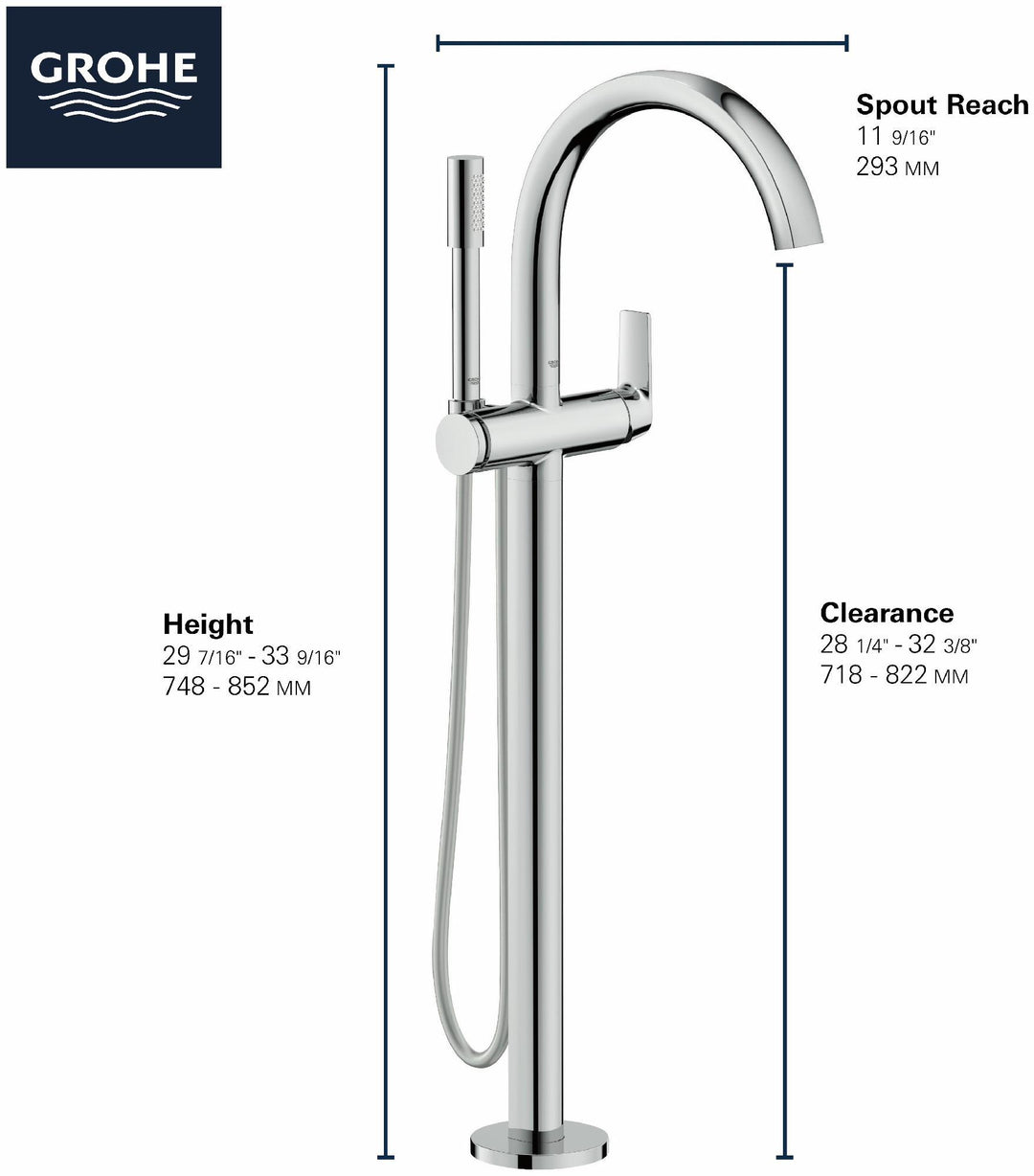 The GROHE Defined Floor Standing Tub Filler with Hand Shower is the essence of transitional design. Combining traditional curves and clean, contemporary lines, this exquisite style is masterfully executed with minimalist proportions outside, superior performance inside, and exacting attention to every detail. These hallmarks of German engineering make the Defined Floor Mounted Tub Filler a worthy focal point in a well-appointed bathroom.