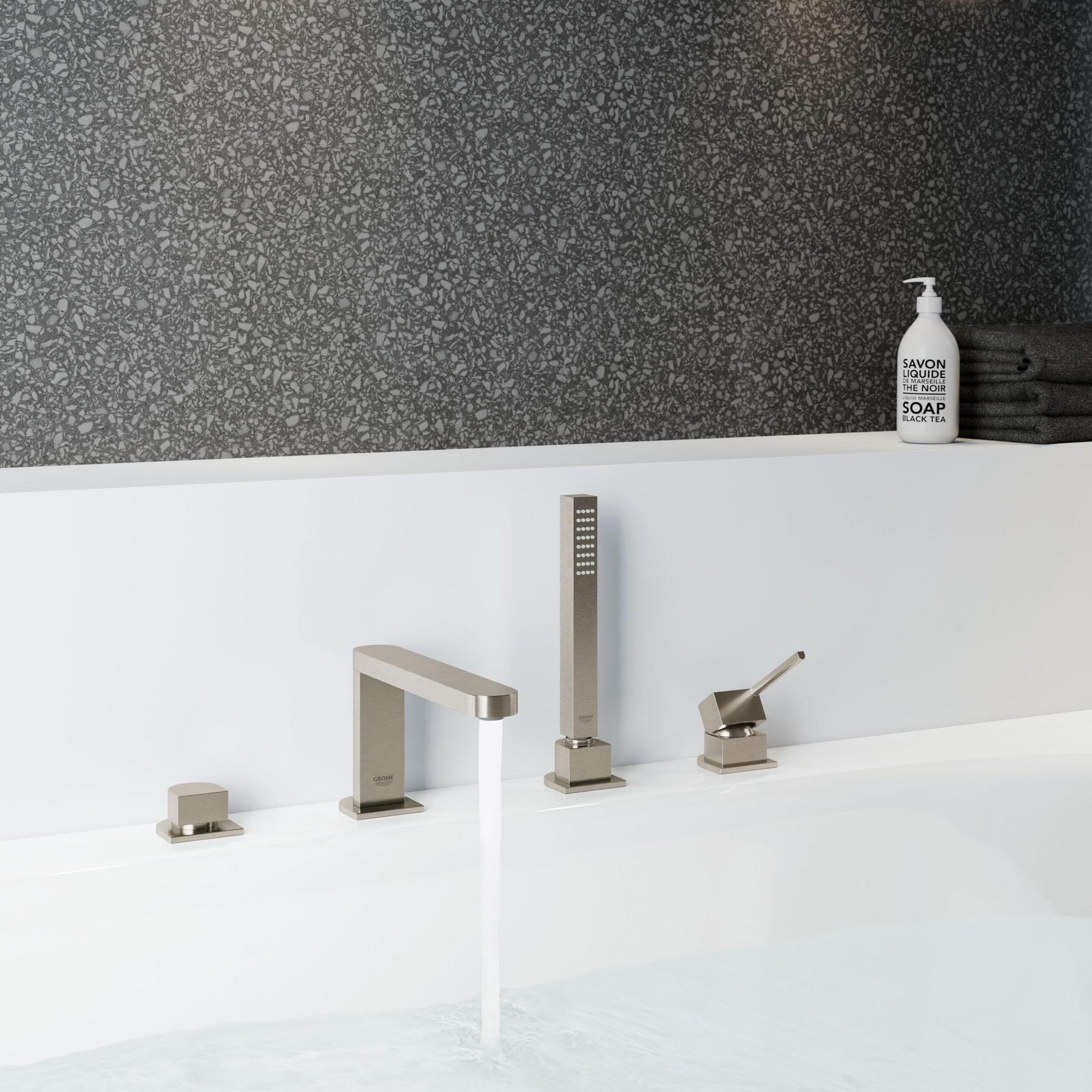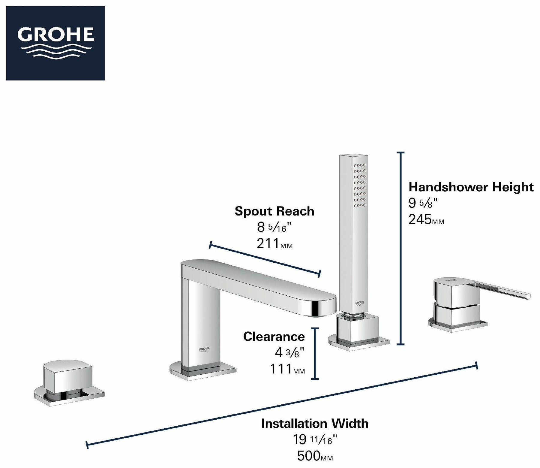 Elegant or minimalist, the GROHE Plus Roman Tub Filler with Hand Shower combines the clean, linear angles of a cube with the gentle curves of a circle making it a distinctive choice no matter the design aesthetic. Engineered to bring comfort and convenience to your bathroom, the Plus Roman Tub Filler features the durable GROHE StarLight coating for easy care and lasting beauty.