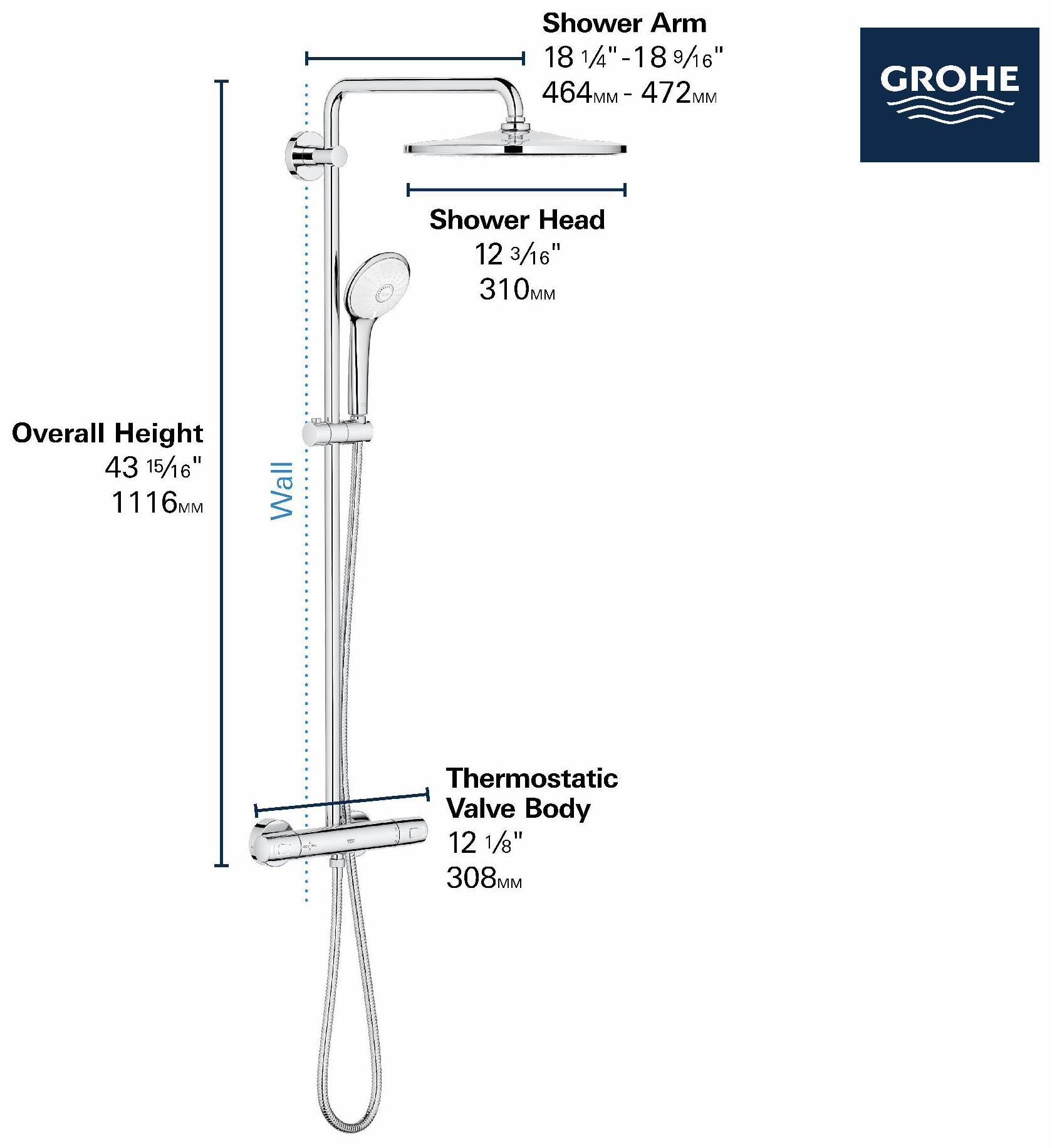 - System includes GROHE CoolTouch thermostatic control, shower head, shower arm, bar with hand-shower bracket, hand shower and metal hose