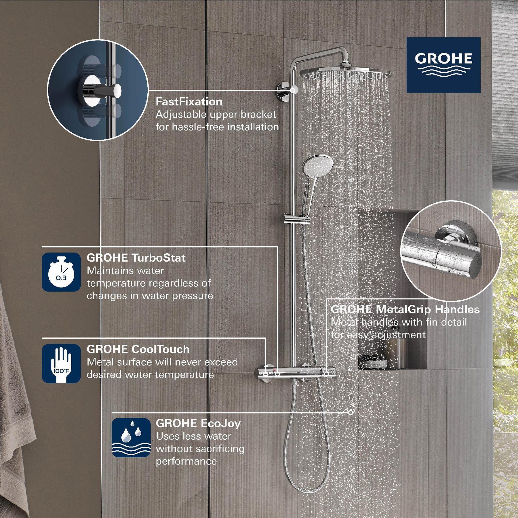 The GROHE Euphoria 310 CoolTouch Thermostatic Shower System offers the ultimate showering experience while providing unmatched protection from scalding. GROHE CoolTouch technology ensures the thermostat body will never get too hot to touch, no matter how hot you like your shower. Sleek and contemporary, this German-engineered system was conceived to manage water for maximum enjoyment and safety featuring the popular GROHE TurboStat that consistently maintains your desired water temperature. Even when fluctuations in water pressure occur, you’ll never experience a sudden icy blast or scalding heat. The generous 12-inch Rainshower Mono 310 Shower Head features GROHE PureRain, a calming spray designed to soothe and relax. Ergonomic hand shower satisfies every showering need with 3 indulgent sprays: soothing Rain, relaxing Massage, and luxurious, water-conserving SmartRain. For those who relish the shower ritual, the Euphoria 310 CoolTouch Thermostatic Shower System exceeds expectations.