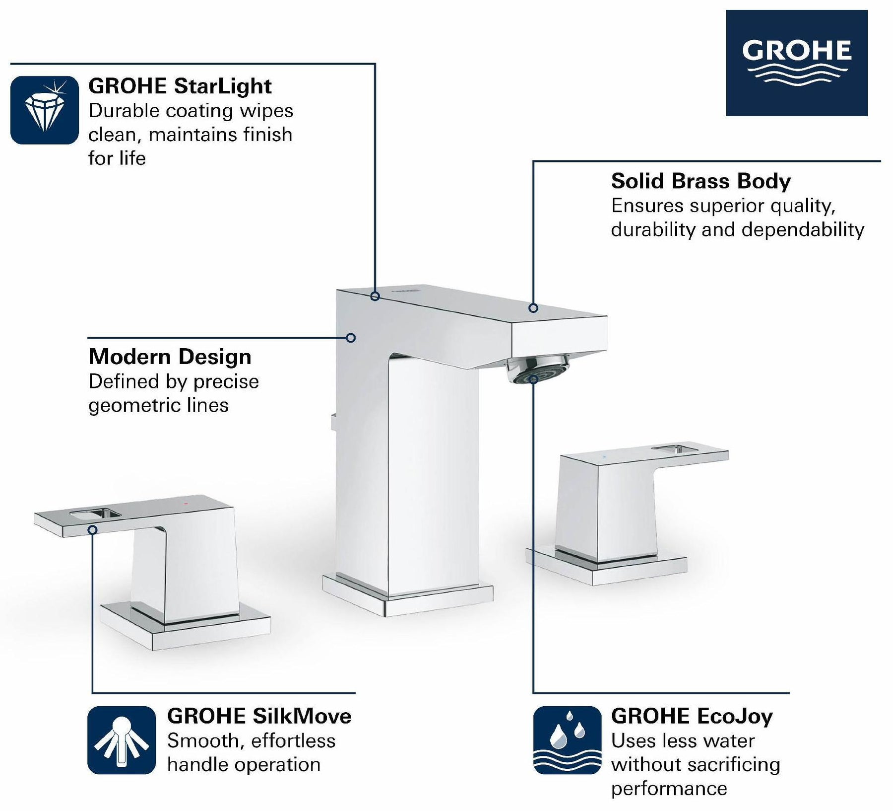 The GROHE Eurocube Widespread Bathroom Faucet combines precise geometric lines with superior performance for the well-appointed bathroom. Eurocube is equipped with a ceramic disc valve for drip-free performance.