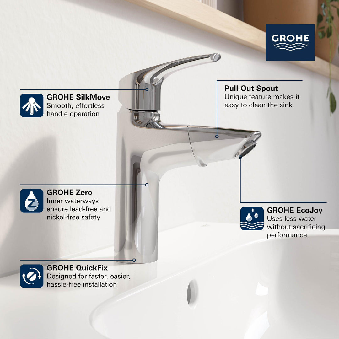 - GROHE SilkMove quality ceramic disc cartridge provides ultra-smooth handle motion to ensure precise control of water flow and temperature