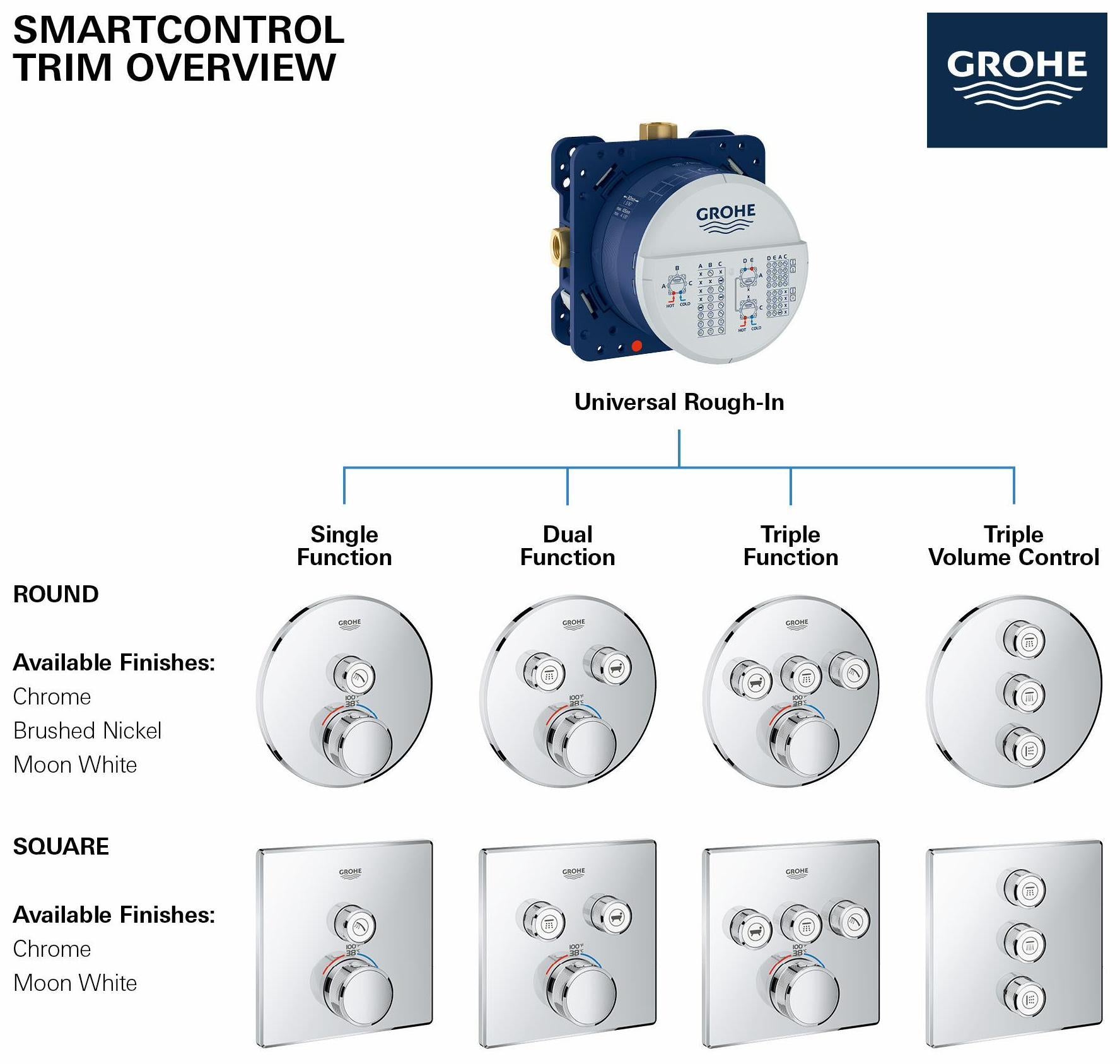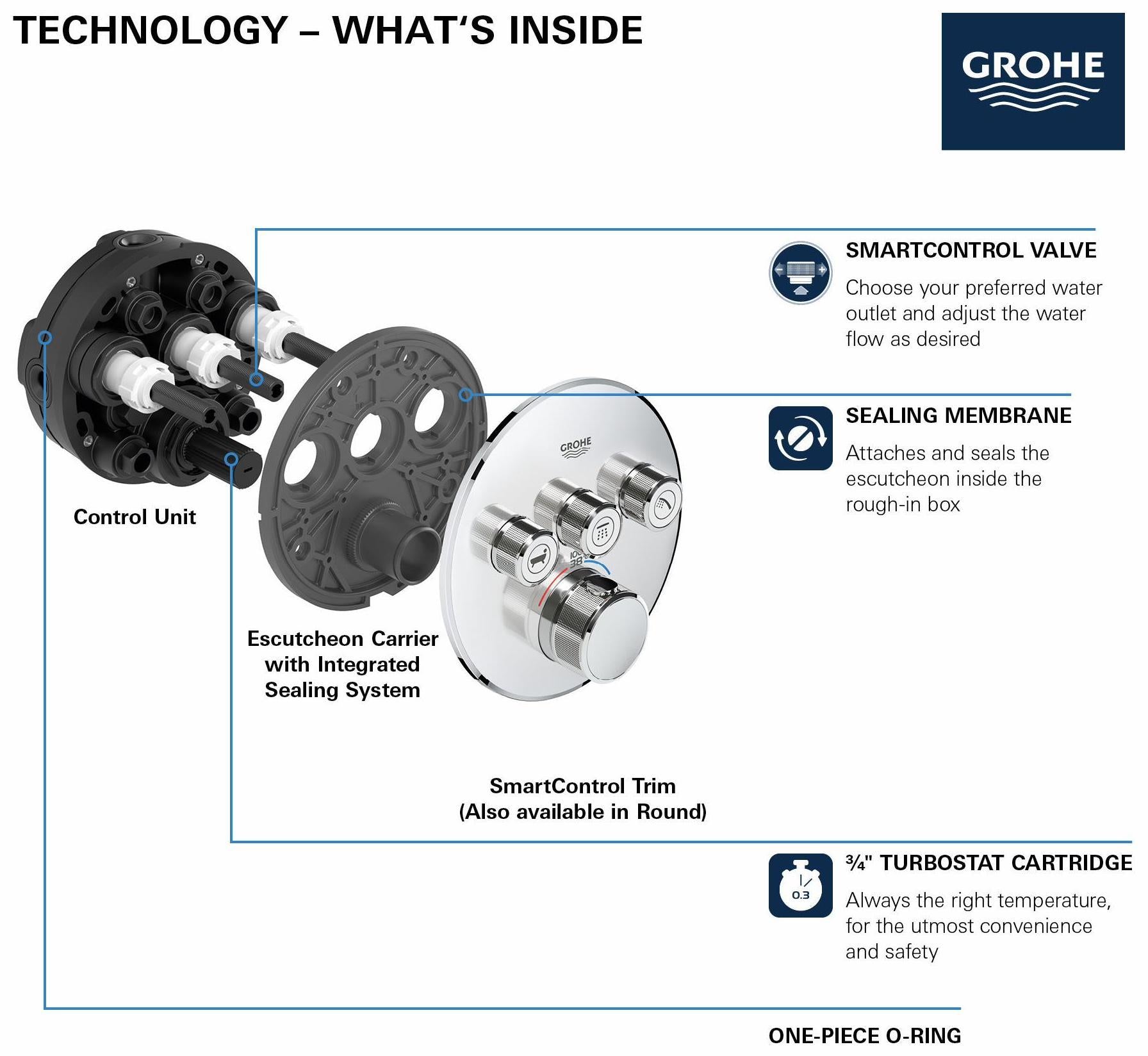 Grohtherm SmartControl – break the mold with this chic, slim thermostat offering total flexibility Choose a thermostat that is as flexible as possible for your most enjoyable shower or bath ever. Packed with useful features, the Grohtherm SmartControl concealed thermostat features a minimalist design and stylish Moon White that will enhance any modern bathroom. The innovative SmartControl technology allows you to select your desired spray source and adjust the water volume at the push-turn of a button. The three valves offer total flexibility, whatever your shower set up – you can control, switch between or even combine different spray patterns and water outlets – perfect for spaces where you want to have hand, head and side showers, as well as a bath. Integrated GROHE Turbostat technology prevents any unpleasant temperature fluctuations. GROHE EasyLogic markings and textured buttons with exchangeable symbols make it easy and intuitive to use. Family-friendly, the GROHE SafeStop override button allows you to set a maximum temperature of 100-degree F/38-degree C to prevent scalding. Water-saving GROHE EcoJoy technology gives you the option of a reduced flow rate with no compromise on enjoyment. Thanks to the GROHE QuickFix system it’s Swift and straightforward to install. The slim profile makes it easy to keep clean, and the chic, durable GROHE StarLight Moon finish will look pristine for years to come. With a slim, round design perfect for that minimalist, streamlined look, this product is bound to enhance your bathroom scheme. Please note that this product must be installed in combination with the GROHE Rapido SmartBox (35601000).