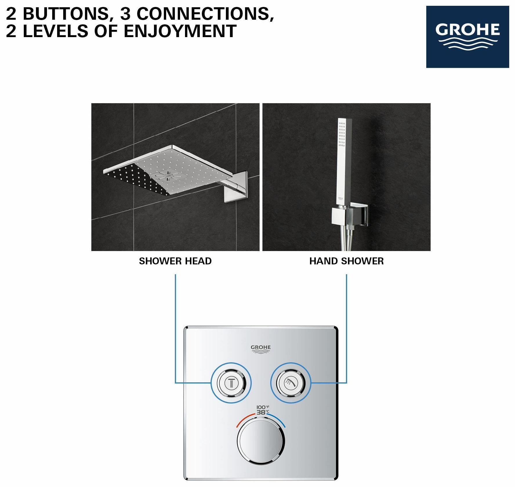The Grohtherm SmartControl Dual Function Thermostatic Trim from GROHE is a slim, contemporary design that will enhance any bathroom and make showering more enjoyable. Innovative and intuitive to use, the dual-function SmartControl lets you adjust water volume from two spray sources with the simple push-turn of a button. Easily switch between sprays, experience each spray individually or enjoy both at the same time. It features integrated GROHE Turbostat technology to keep water temperature consistent for the duration of your shower, preventing any unpleasant hot/cold fluctuations. Please note that this product must be installed in combination with the GROHE Rapido SmartBox (35601000).