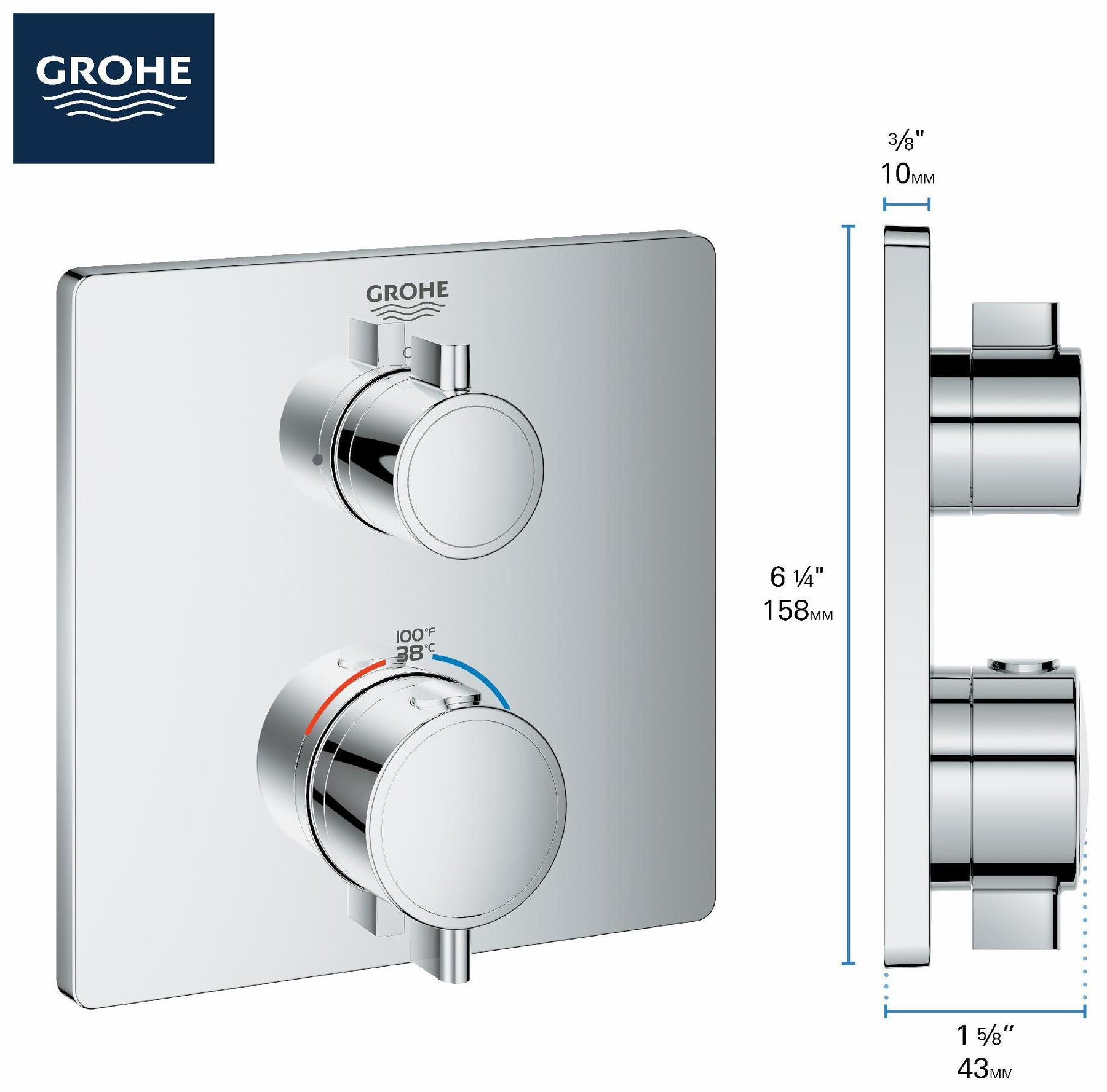 From its slim profile to its intuitive design, the GROHE Grohtherm Single Function 2-Handle Thermostatic Trim with Control Module streamlines the bathroom in both style and experience. Clean and contemporary, it features an upper handle to control volume and on/off, and a lower handle to control temperature. Thoughtfully designed for comfort and enjoyment, Grohtherm features GROHE Turbostat to maintain consistent temperature and GROHE SafeStop to prevent scalding.