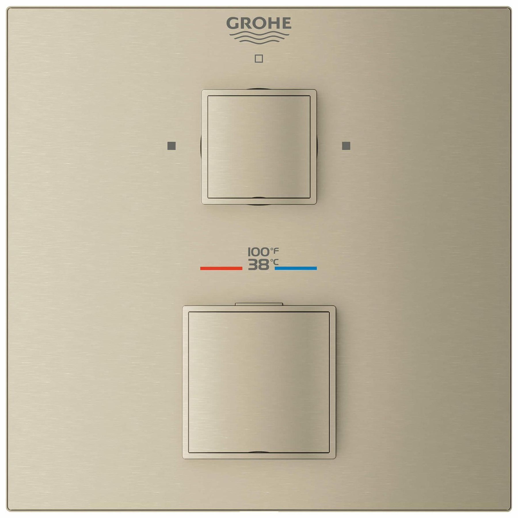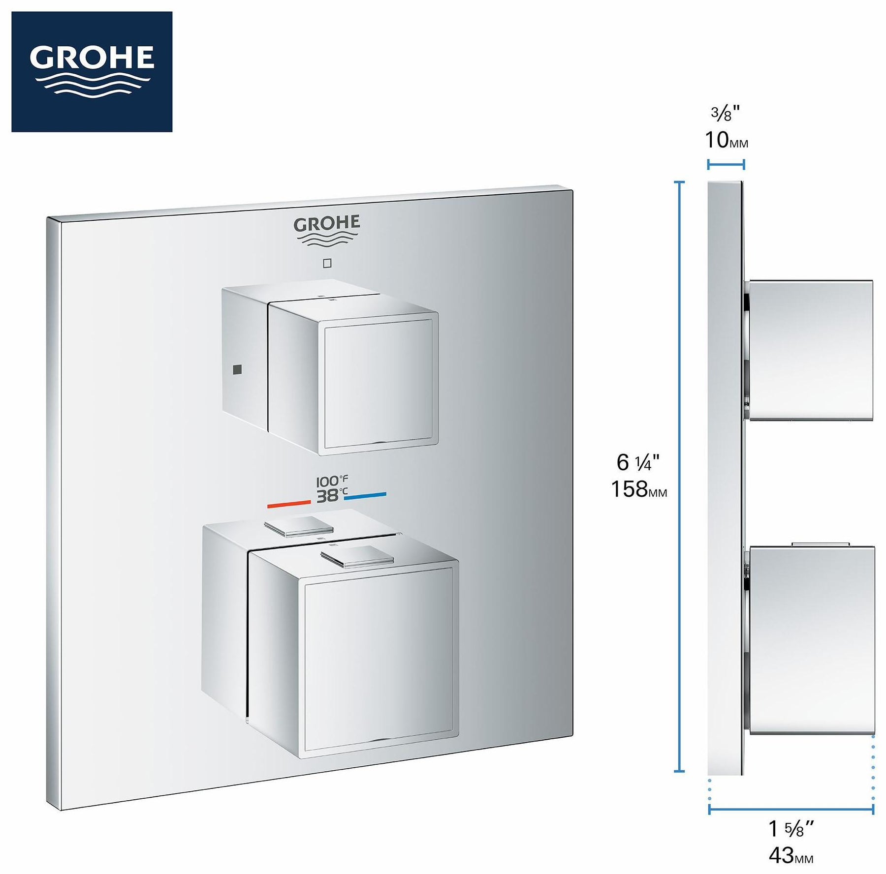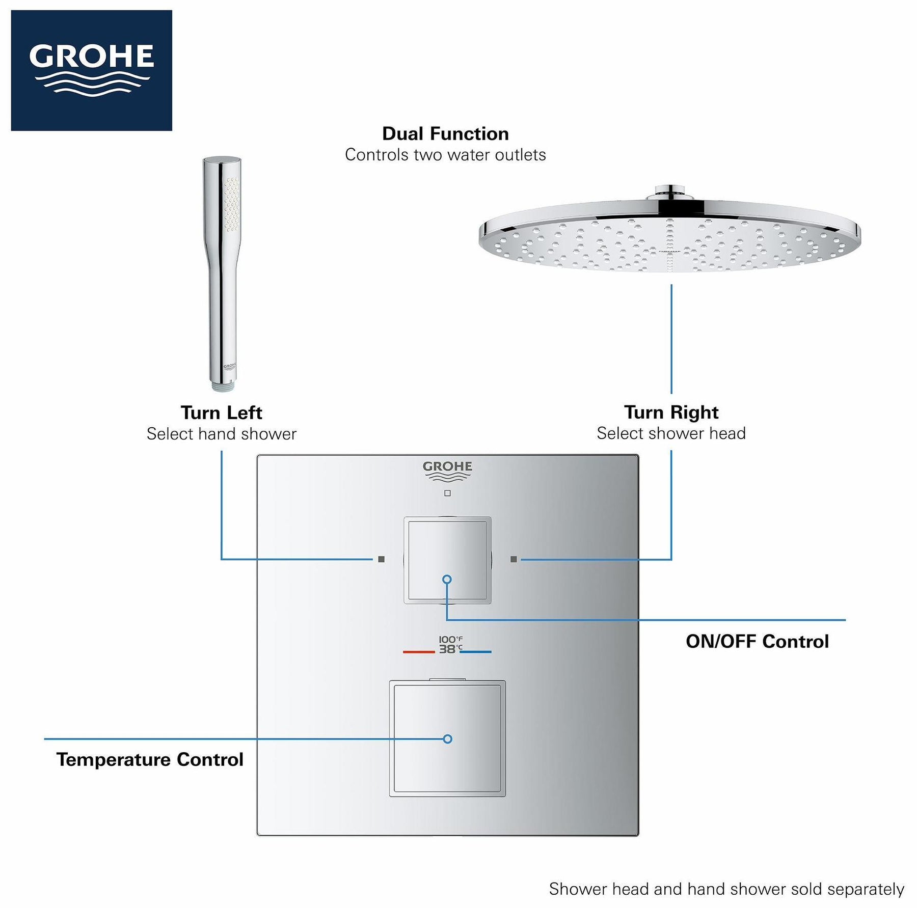 From its artful cube profile to its intuitive operation, the GROHE Grohtherm Cube Dual Function 2-Handle Thermostatic Trim with Control Module lends clean, geometric lines to a contemporary bathroom. Thoughtfully designed for comfort and enjoyment, Grohtherm features an upper handle with integrated 2-way diverter to easily switch from shower head to hand shower, and a lower handle to control temperature. Equipped with GROHE Turbostat to maintain consistent temperature and GROHE SafeStop to prevent scalding, it’s the perfect combination of style and substance in today’s home.
