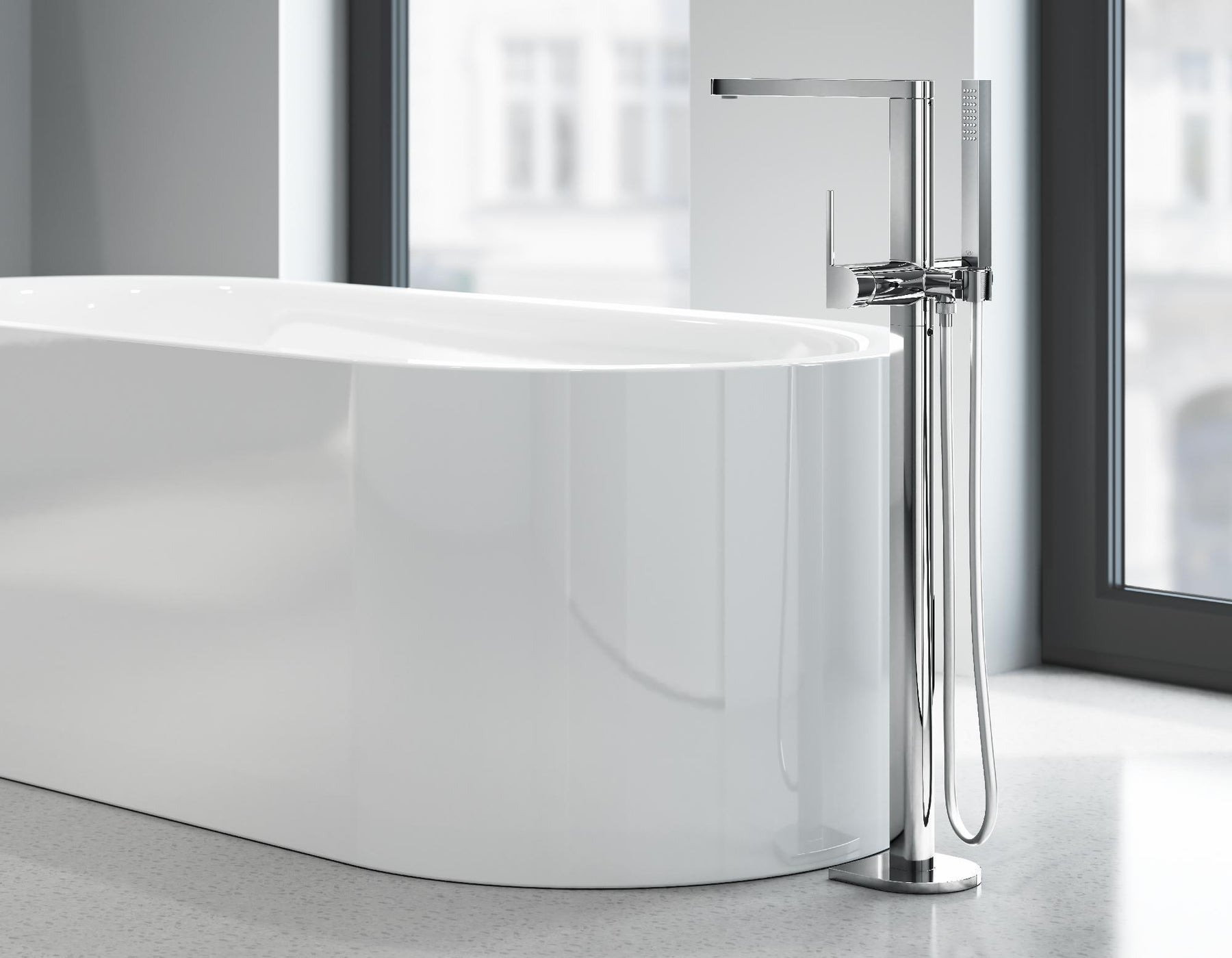 Elegant or minimalist, the GROHE Plus Floor-Standing Tub Filler combines the clean, linear angles of a cube with the gentle curves of a circle making it a distinctive focal point no matter the design aesthetic. This contemporary tub filler includes the Euphoria Cube Hand Shower with GROHE DreamSpray that dispenses water evenly for a more enjoyable experience. Engineered to bring comfort and convenience to your bathroom, the Plus Floor Standing Tub Filler features GROHE SilkMove for smooth, precise handle motion and the durable GROHE StarLight coating for easy care and lasting beauty.