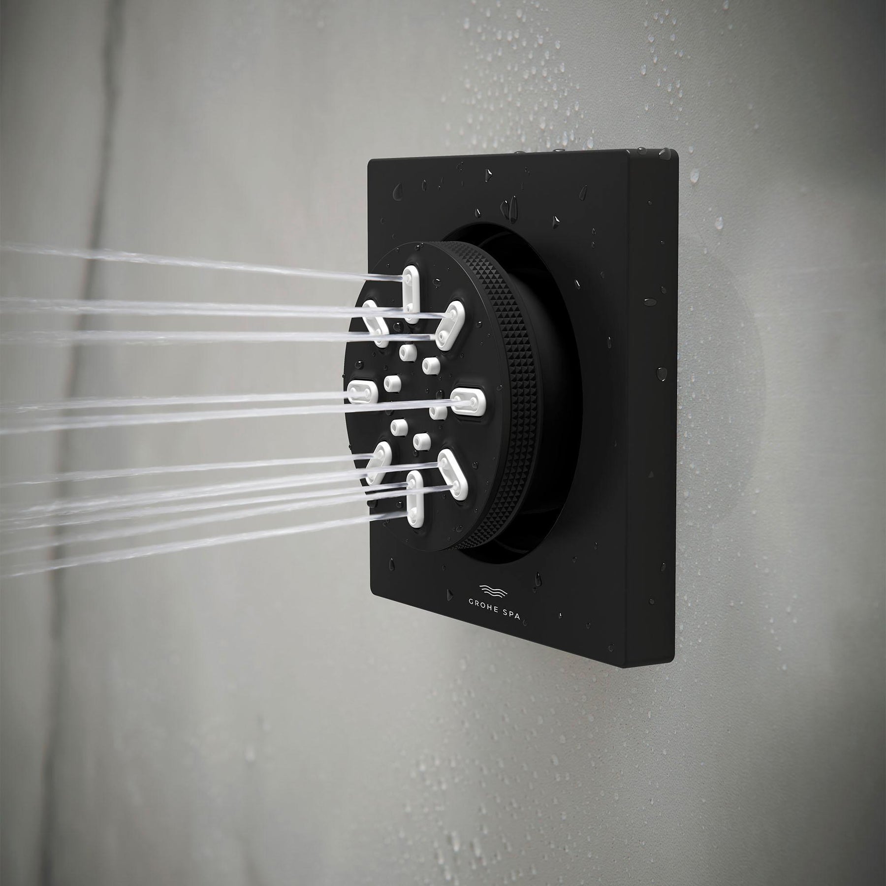 The GROHE SPA Rainshower Aqua Body Spray elevates your showering experience with its choice of spray options and sleek design. The Rainshower Aqua Body Spray delivers soothing GROHE Rain or invigorating ActiveJet sprays. Slim and unobtrusive, it has a low 3/8” profile to complement the clean lines of today’s modern shower. Easy to use, the body spray pops out when the water is turned on and can be rotated to desired spray pattern. Adjust spray angle for personal preference. Once the water is turned off, the body spray will quietly retract back into the wall for a clean, flush look.