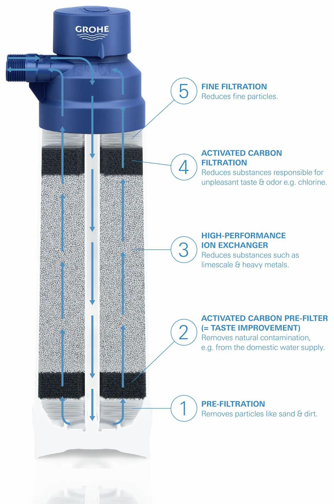 - Filters chlorine, organic compounds such as trace substances of pesticides and reduces heavy metals like lead, copper, iron or zinc