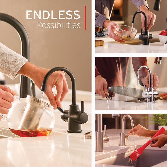 - On-demand, near-boiling, instant hot water (approximately 200 degrees F) right next to your main kitchen faucet when you need it, for cooking, cleaning, and more; a time, space, and energy saver that lets you get on with more important things in life