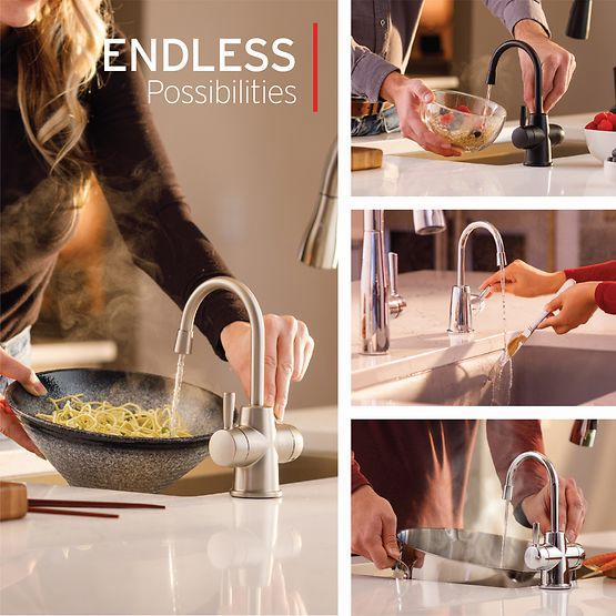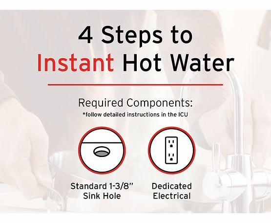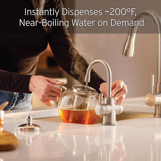 - On-demand, near-boiling, instant hot water (approximately 200 degrees F) right next to your main kitchen faucet when you need it, for cooking, cleaning, and more; a time, space, and energy saver that lets you get on with more important things in life