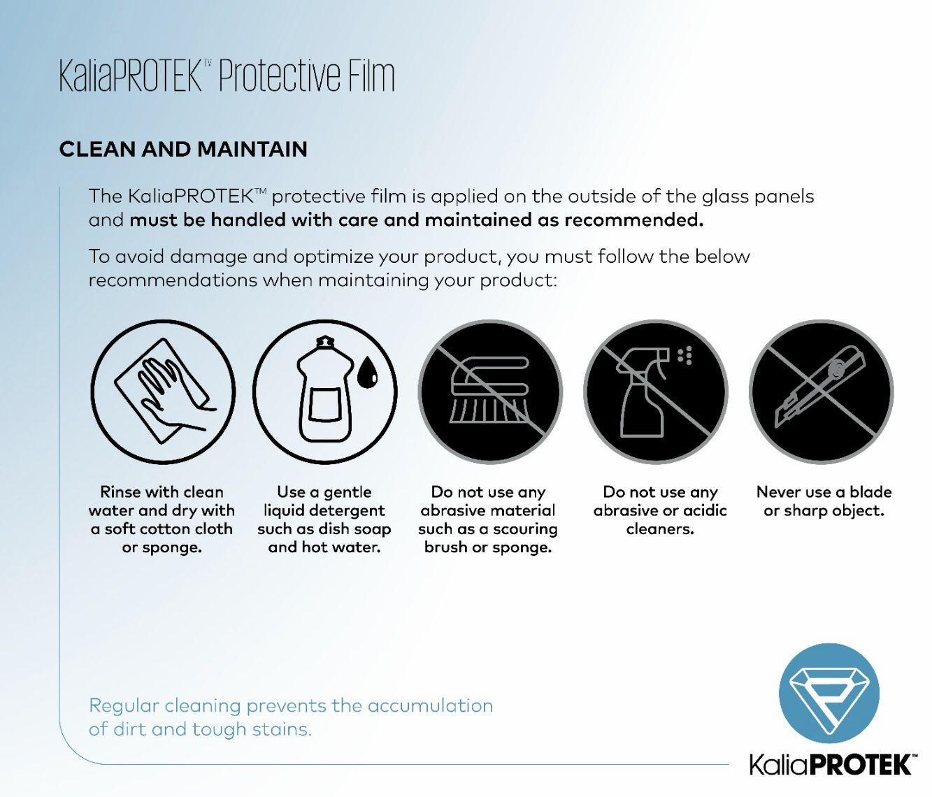 • Mobile panels in clear tempered glass of 8 mm (5/16”) with KaliaPROTEKTM protective film (the protective film is installed on the outside of the panels