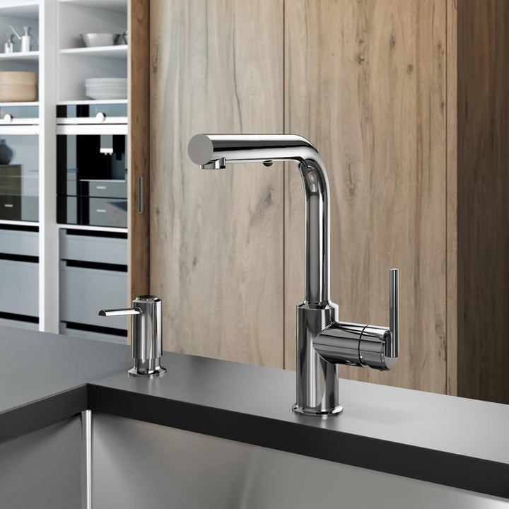 - Single-handle kitchen faucet with ergonomic pull-out spray