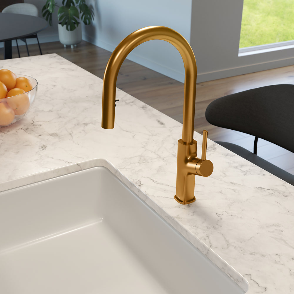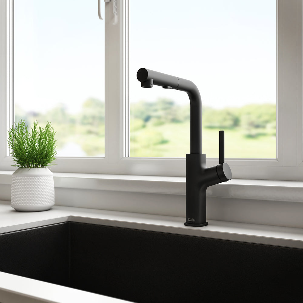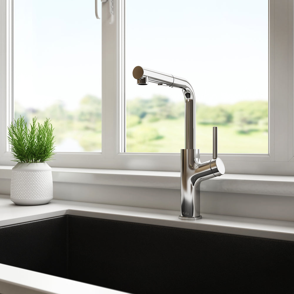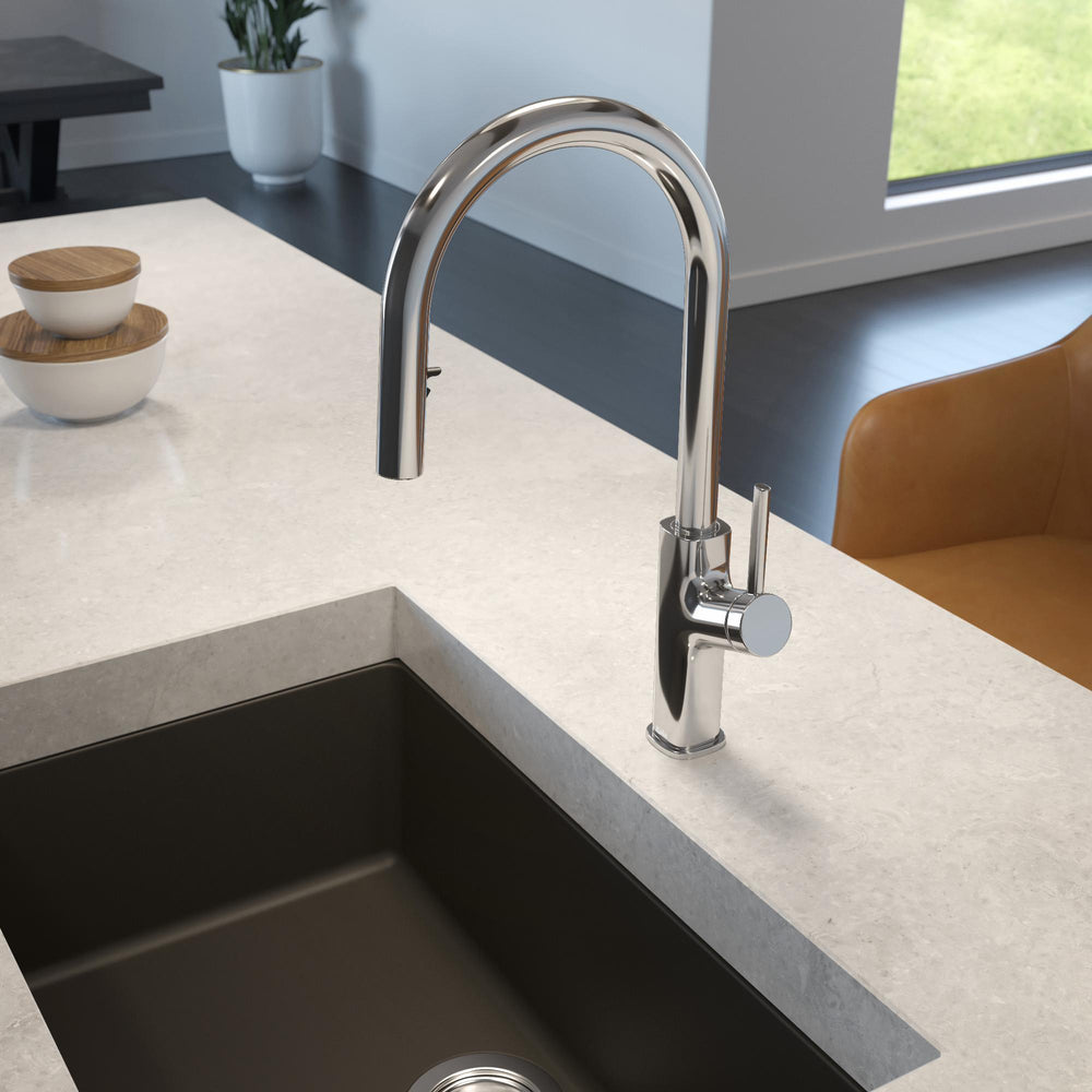 - Single-handle kitchen faucet with ergonomic hidden pull-down spray