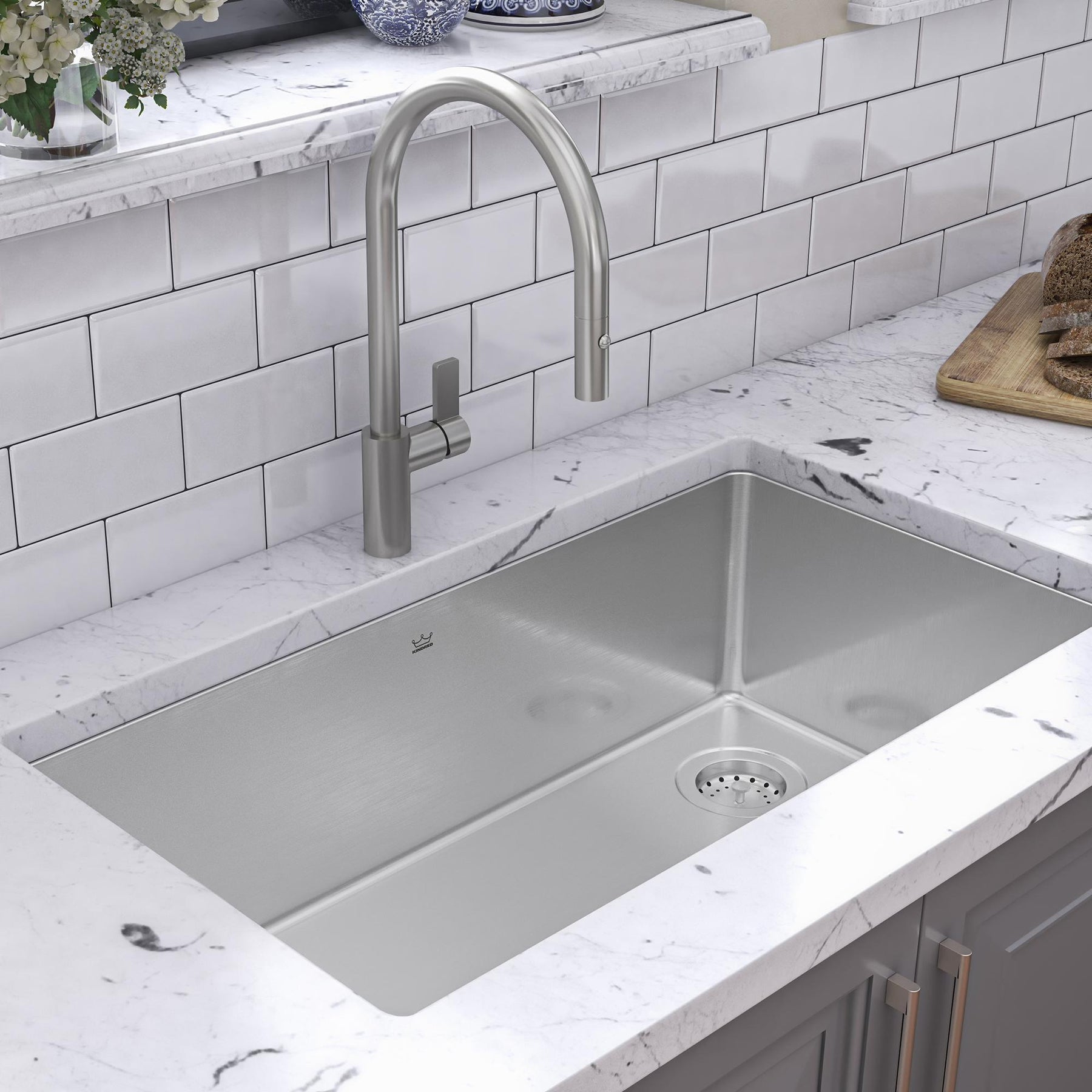 Brookmore Collection 32.5-in x 18.2-in Undermount Single Bowl Stainless Steel Kitchen Sink. The Brookmore stainless steel sink collection will create something truly unique that fits both prepping and cleaning needs. Made with high-quality 18-gauge stainless steel with a rich chromium content that helps shield the material from corrosion and prevents bacterial growth. The undermount sink style provides a sleek, modern look and makes cleaning up spills and messes easy. The spacious 9" deep bowl is perfect for soaking and washing stacks of dishes, and the sound-dampening system goes to work to reduce the noise caused by a garbage disposal or running water.