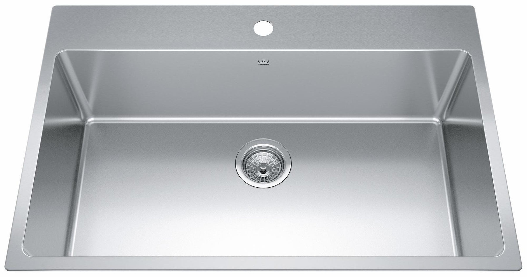 Brookmore Collection 33-in x 22-in Drop in 1-Hole Single Bowl Stainless Steel Kitchen Sink. The Brookmore stainless steel sink collection will create something truly unique that fits both prepping and cleaning needs. Made with high-quality 18-gauge stainless steel with a rich chromium content that helps shield the material from corrosion and prevents bacterial growth. This sink features the EZ Torque™ simplified fastener system that lets you quickly drop and drill your sink into place, securely locking the sink to the countertop. The spacious 9" deep bowl is perfect for soaking and washing stacks of dishes, and the sound-dampening system goes to work to reduce the noise caused by a garbage disposal or running water.