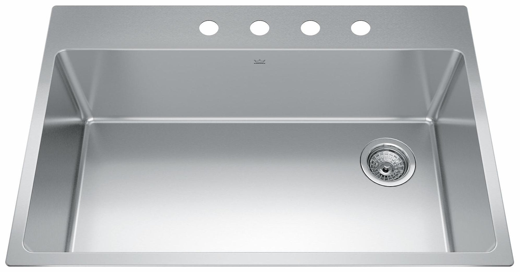Brookmore Collection 33-in x 22-in Drop in 4-Hole Single Bowl Stainless Steel Kitchen Sink. The Brookmore stainless steel sink collection will create something truly unique that fits both prepping and cleaning needs. Made with high-quality 18-gauge stainless steel with a rich chromium content that helps shield the material from corrosion and prevents bacterial growth. This sink features the EZ Torque™ simplified fastener system that lets you quickly drop and drill your sink into place, securely locking the sink to the countertop. The spacious 9" deep bowl is perfect for soaking and washing stacks of dishes, and the sound-dampening system goes to work to reduce the noise caused by a garbage disposal or running water.