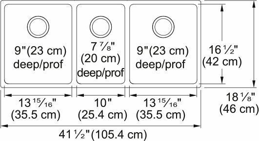 - Overall Dimensions: 41.5-in left-to-right x 18.13-in front-to-back; Large Bowl Interior Dimensions: 13.9-in left-to-right x 16.5-in front-to-back, Bowl Depth: 9-in; Small Bowl Interior Dimensions: 10-in left-to-right x 16.5-in front-to-back, Bowl Depth: 7.8-in; Fits minimum cabinet size 45-in