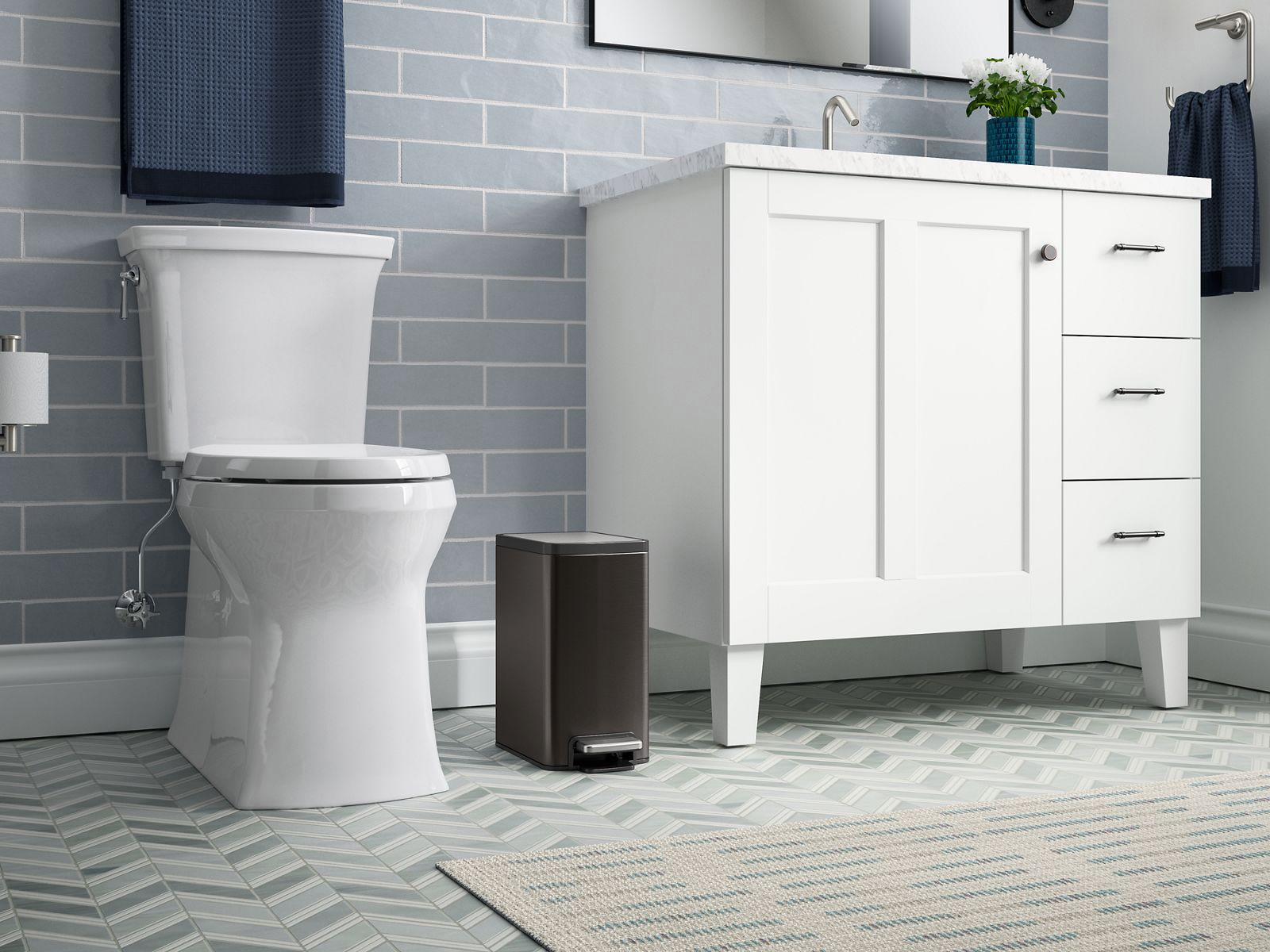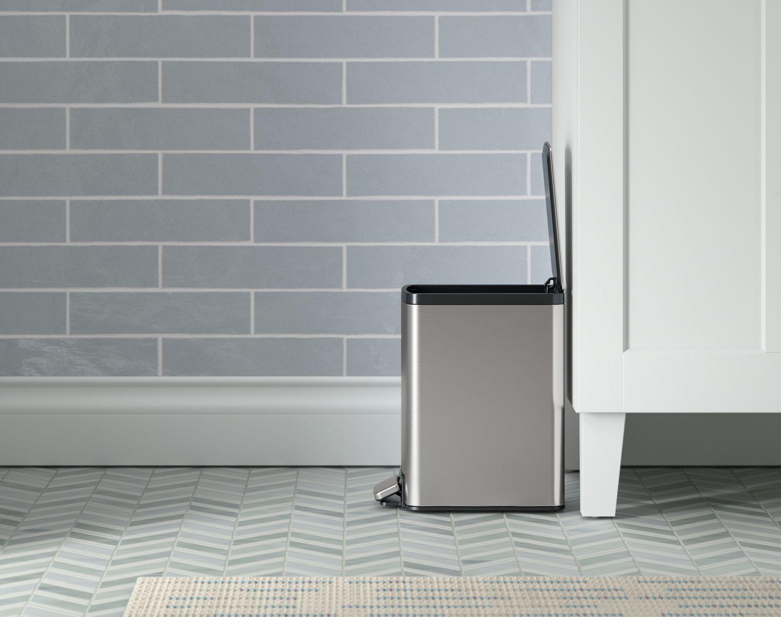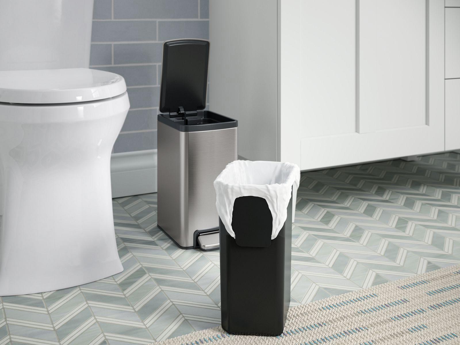 Crafted with thoughtful details and smart functionality, this KOHLER step trash can will simplify your daily routine at home and meet the style demands of its surroundings. The 6-liter step trash can is ideal for small spaces, such as in a home office or next to a toilet. It opens with a sturdy foot pedal, allowing for hands-free operation. The functional design, with tabs that secure the bag in place, allows you to use any plastic shopping bag.