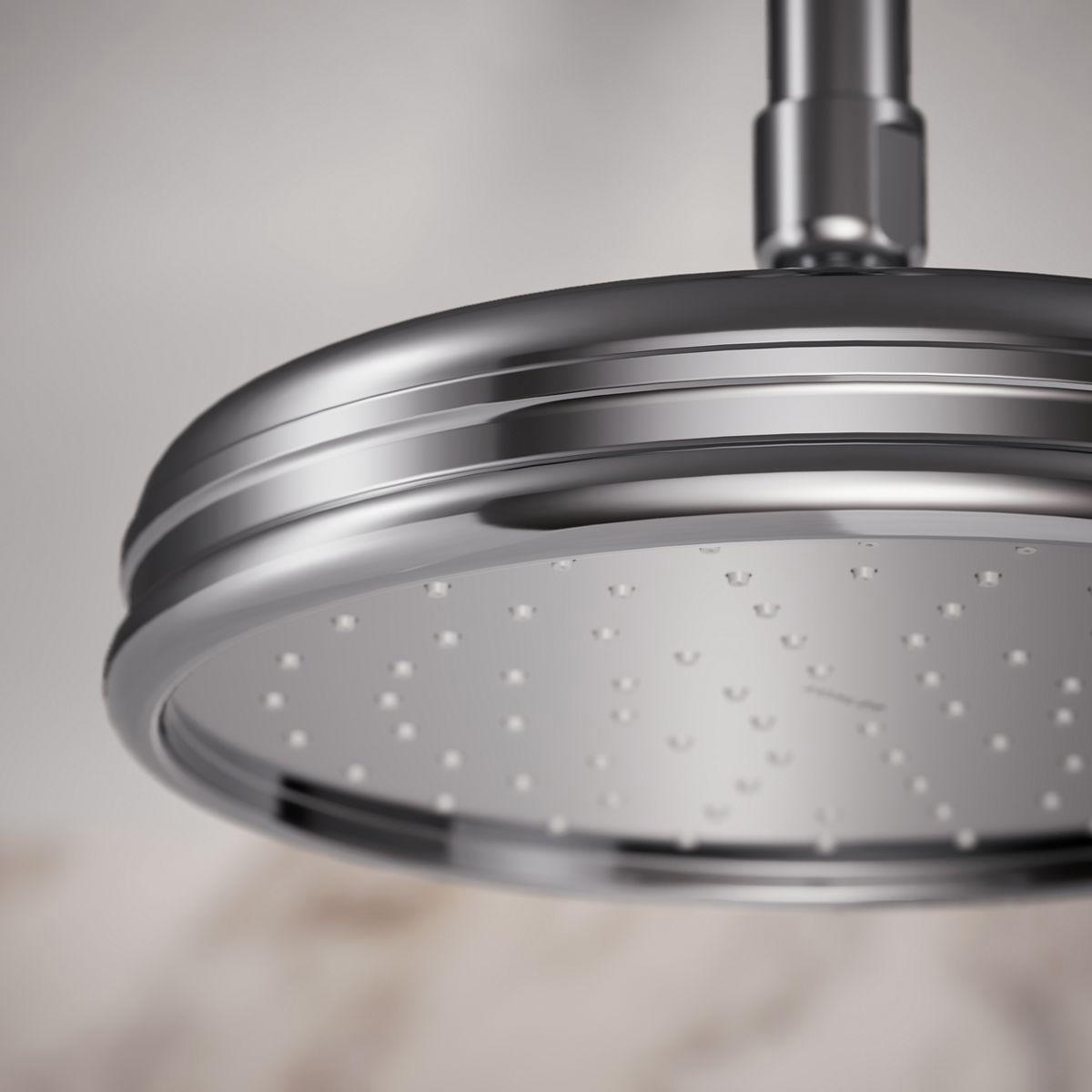 Enjoy a shower that simulates the soaking deluge of a warm summer downpour. This traditional-style rainhead features innovative Katalyst air-induction technology, which efficiently mixes air and water to produce large water droplets and deliver a powerful, thoroughly drenching overhead shower experience. Its clean good looks and durable finish coordinate with many other KOHLER faucets and accessories.