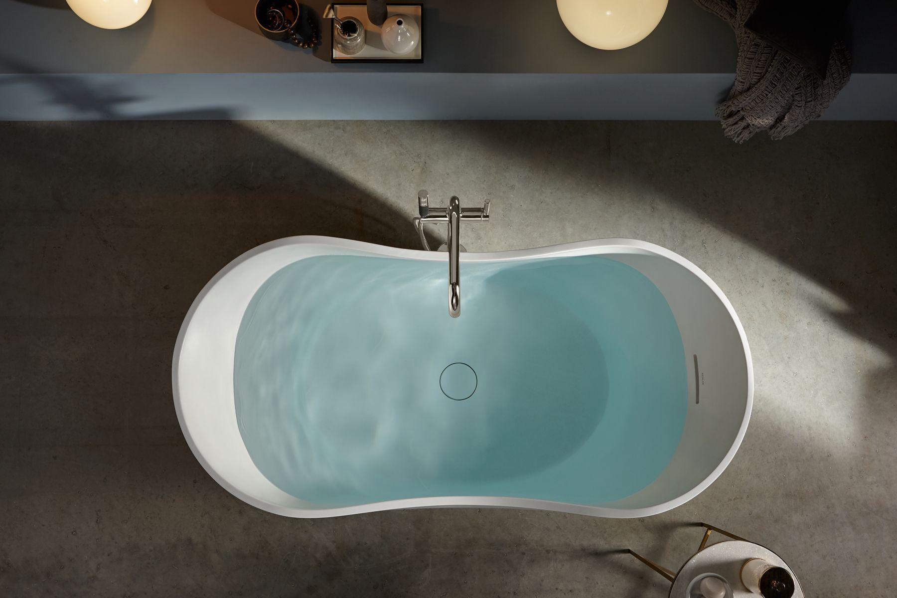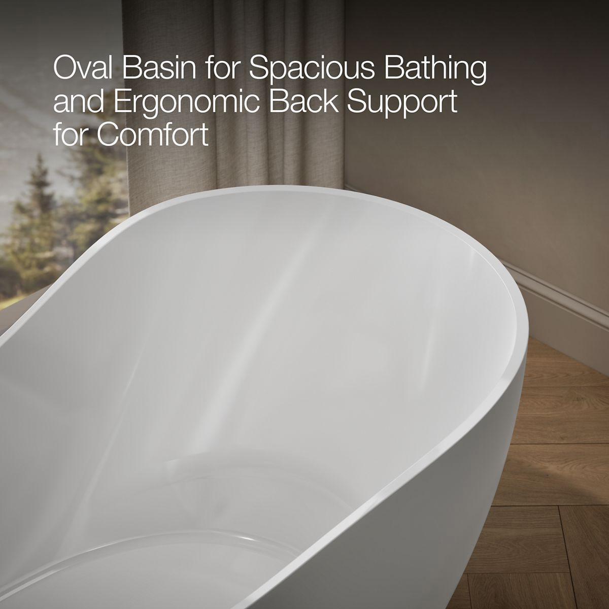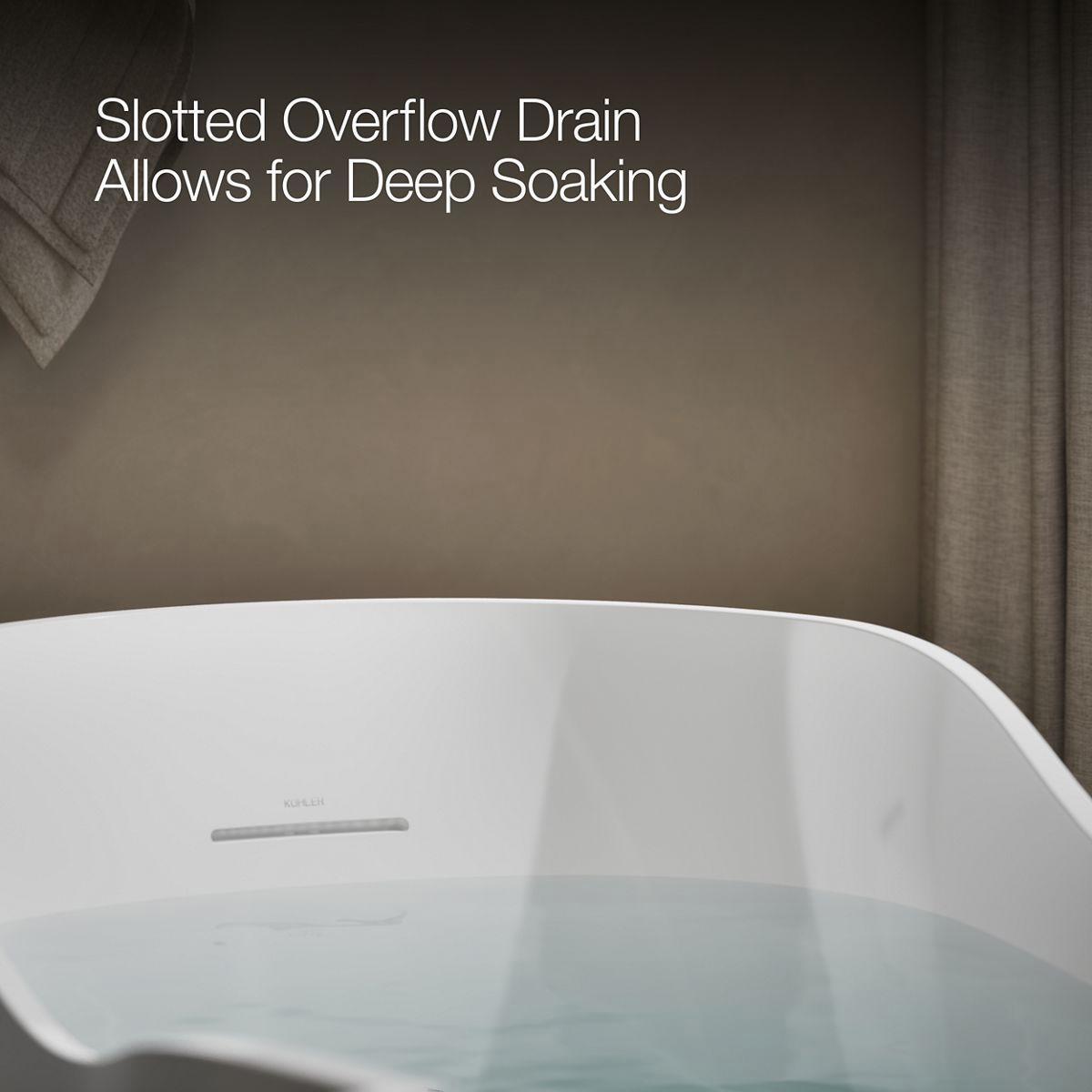 With an organic oval shape inspired by clay pottery, the Abrazo bath makes a striking focal point for your contemporary bathroom. An integral slotted overflow allows for the deepest possible water level. KOHLER Lithocast(R) cast resin material has the attractive finish of smooth stone but feels warm to the touch and is easy to clean.