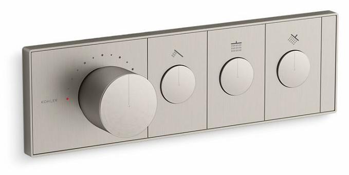 Thermostatic technology allows you to maintain consistent temperature and flow control for the ultimate shower experience. This sleek thermostatic valve control panel with recessed push buttons is designed for use with an Anthem three-port thermostatic valve (K-26341). The trim plate includes a temperature control knob with integrated adjustable high-temperature limit stop as well as shower outlet activation buttons that pop out for the adjustment of water flow (up to 8 gpm).