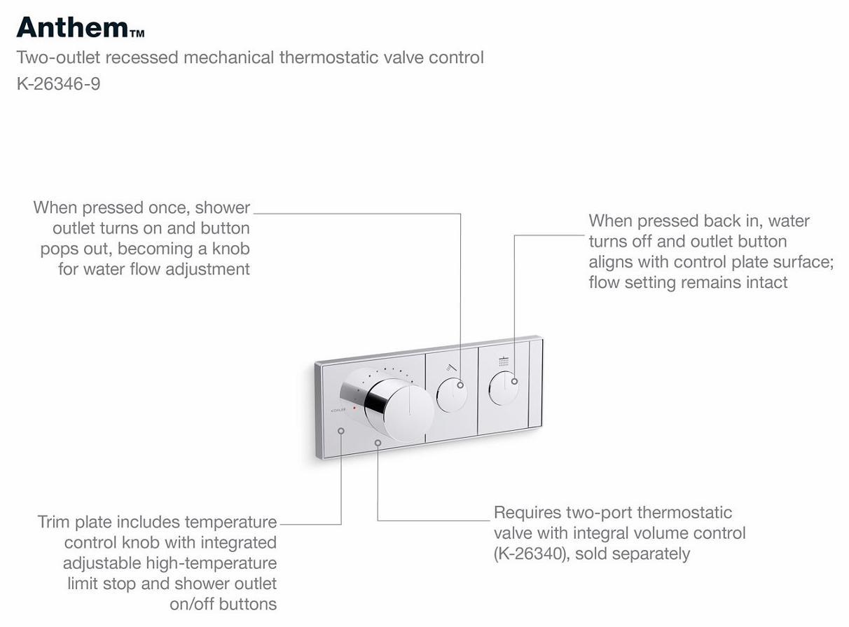 Thermostatic technology allows you to maintain consistent temperature and flow control for the ultimate shower experience. This sleek thermostatic valve control panel with recessed push buttons is designed for use with an Anthem two-port thermostatic valve (K-26340). The trim plate includes a temperature control knob with integrated adjustable high-temperature limit stop as well as shower outlet activation buttons that pop out for the adjustment of water flow (up to 8 gpm).