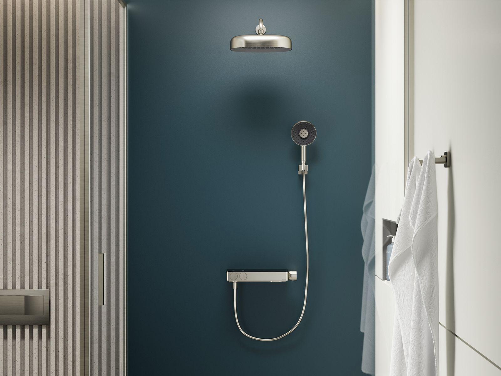 Create an elegant, spa-like multi-outlet showering experience with the exposed thermostatic valve and shower column. Influenced by iconic design, the two-way system features an exposed shower column with thermostatic valve, control panel, and handshower holder. The integrated thermostatic valve/control panel provides a built-in shelf and features intuitive push-button and dial controls. This easy-to-install shower column and valve combo was designed for use with a single-function rainhead, multifunction handshower, and hose (sold separately).