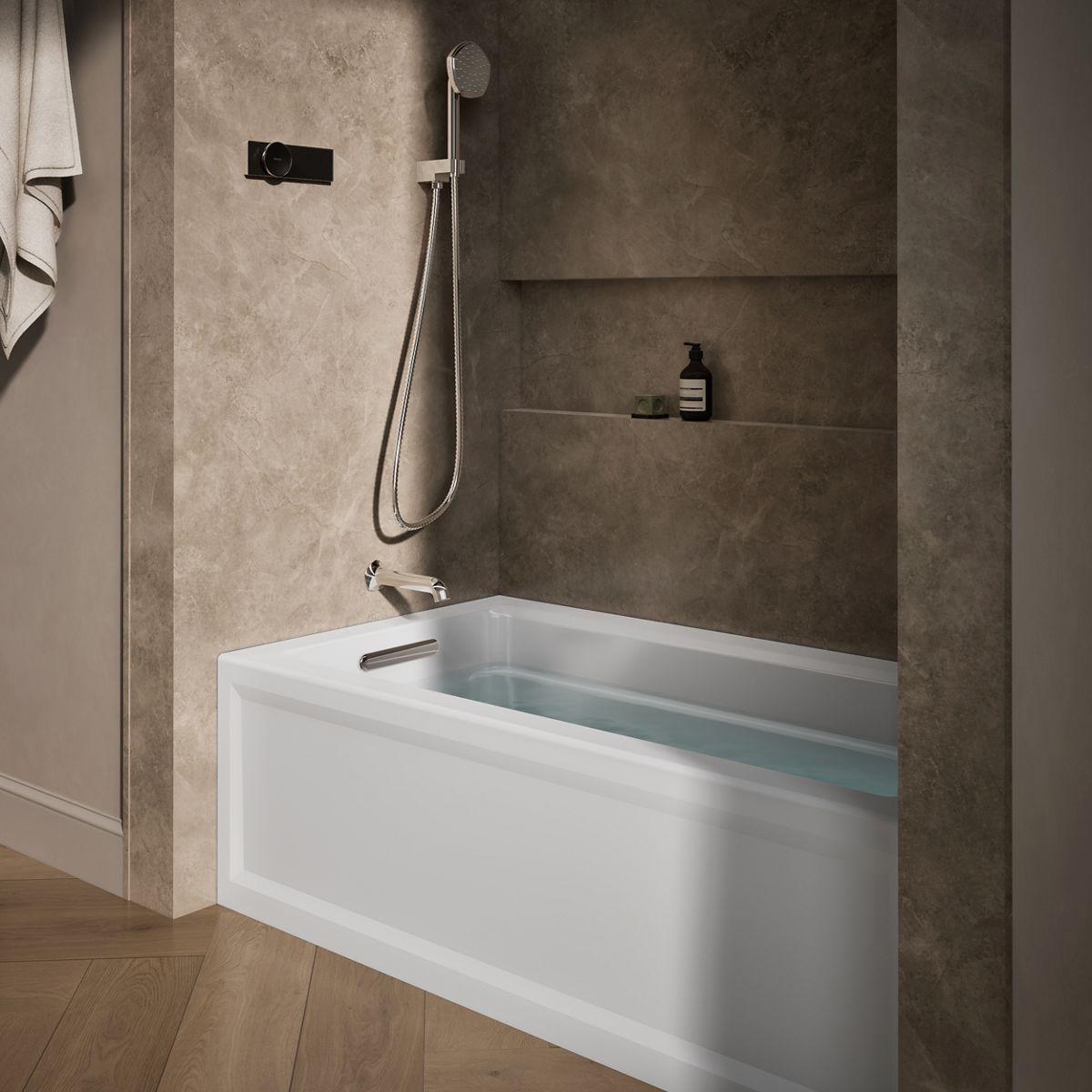 Taking its design cues from traditional Craftsman furniture, the Archer line of baths reveals beveled edges and curved bases for a clean, sophisticated style. This bath's heated surface warms the back and neck with adjustable temperature settings to create a soothing, spa-like environment. A low step-over height offers easy access while allowing deep, comfortable soaking. A lumbar arch gently support the natural curves of your body.