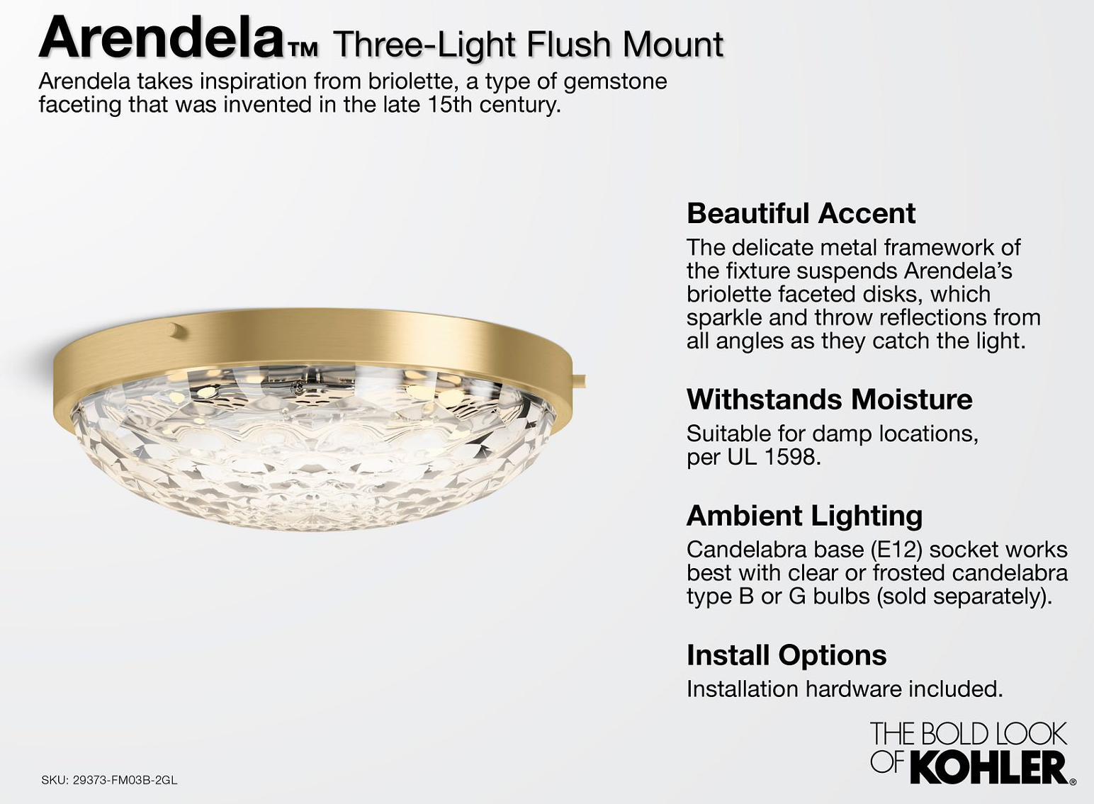 Arendela takes inspiration from briolette, a type of gemstone faceting that was invented in the late 15th century. The briolette cut is a pear-shaped stone that has facets on the entire surface. Typically used as a bead, the faceted stone hangs and catches the light from all sides, and is the inspiration for KOHLER Briolette Artist Editions vessel sink and our Arendela lighting collection.