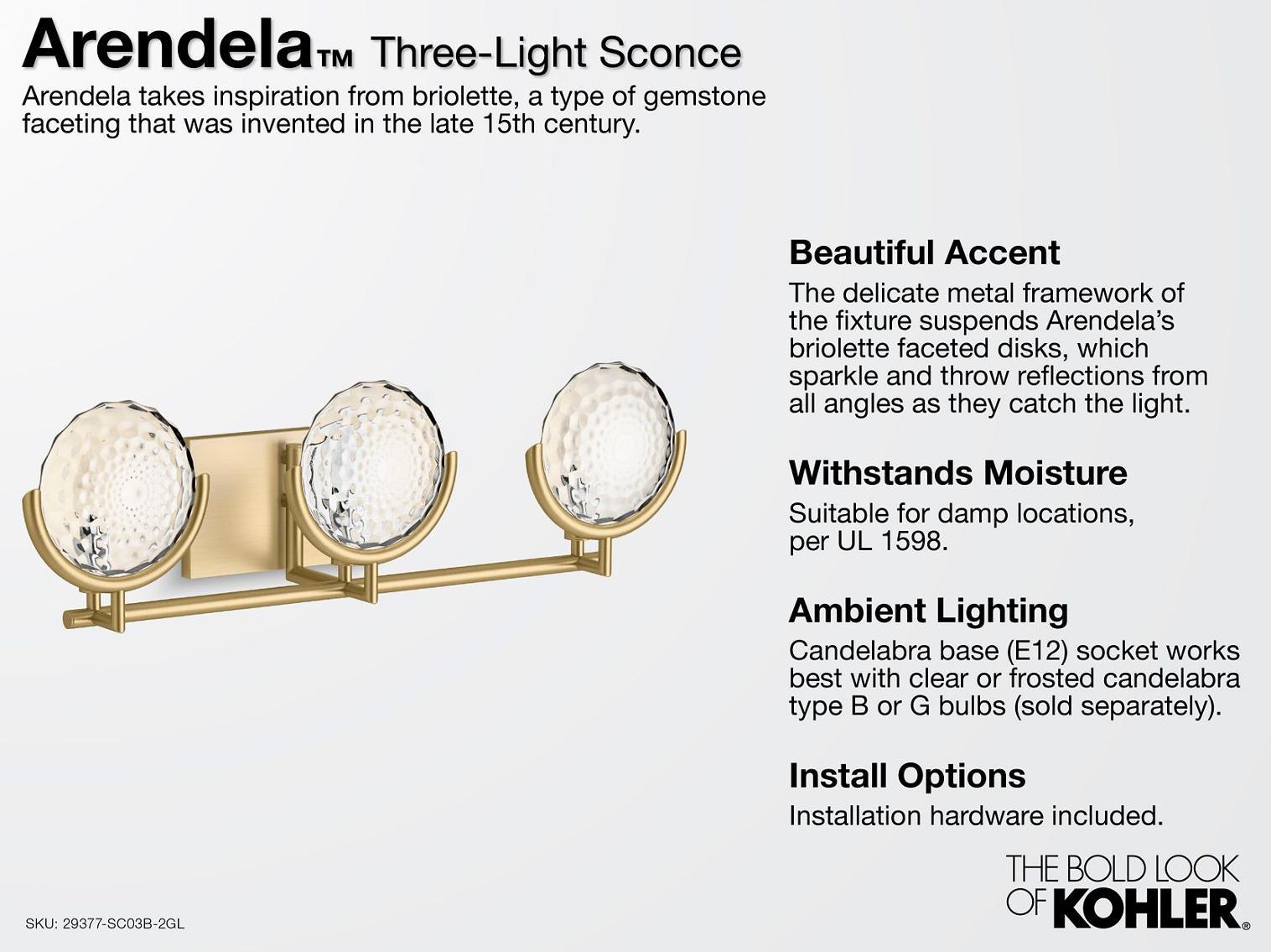 Arendela takes inspiration from briolette, a type of gemstone faceting that was invented in the late 15th century. The briolette cut is a pear-shaped stone that has facets on the entire surface. Typically used as a bead, the faceted stone hangs and catches the light from all sides and is the inspiration for KOHLER Briolette Artist Editions vessel sink and our Arendela lighting collection.
