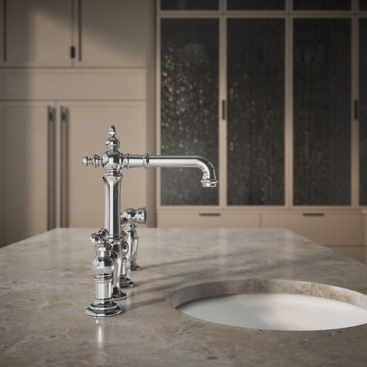 The Artifactsfaucet collection brings you classic designs reimagined in fresh new ways for various task areas of the kitchen. Featuring a compact profile ideal for a secondary sink, this Artifactsbridge faucet celebrates vintage style with its lever handles and Victorian-inspired swivel spout. A convenient side spray lets you switch from gentle BerrySoft spray to powerful Sweep spray at the touch of a button, so you're set for food prep as well as quick cleanup.