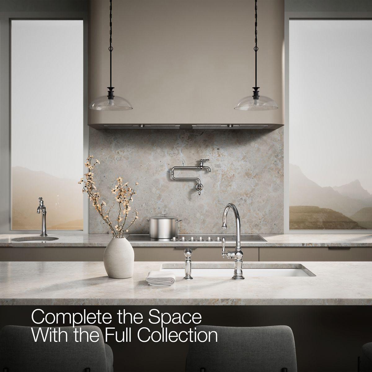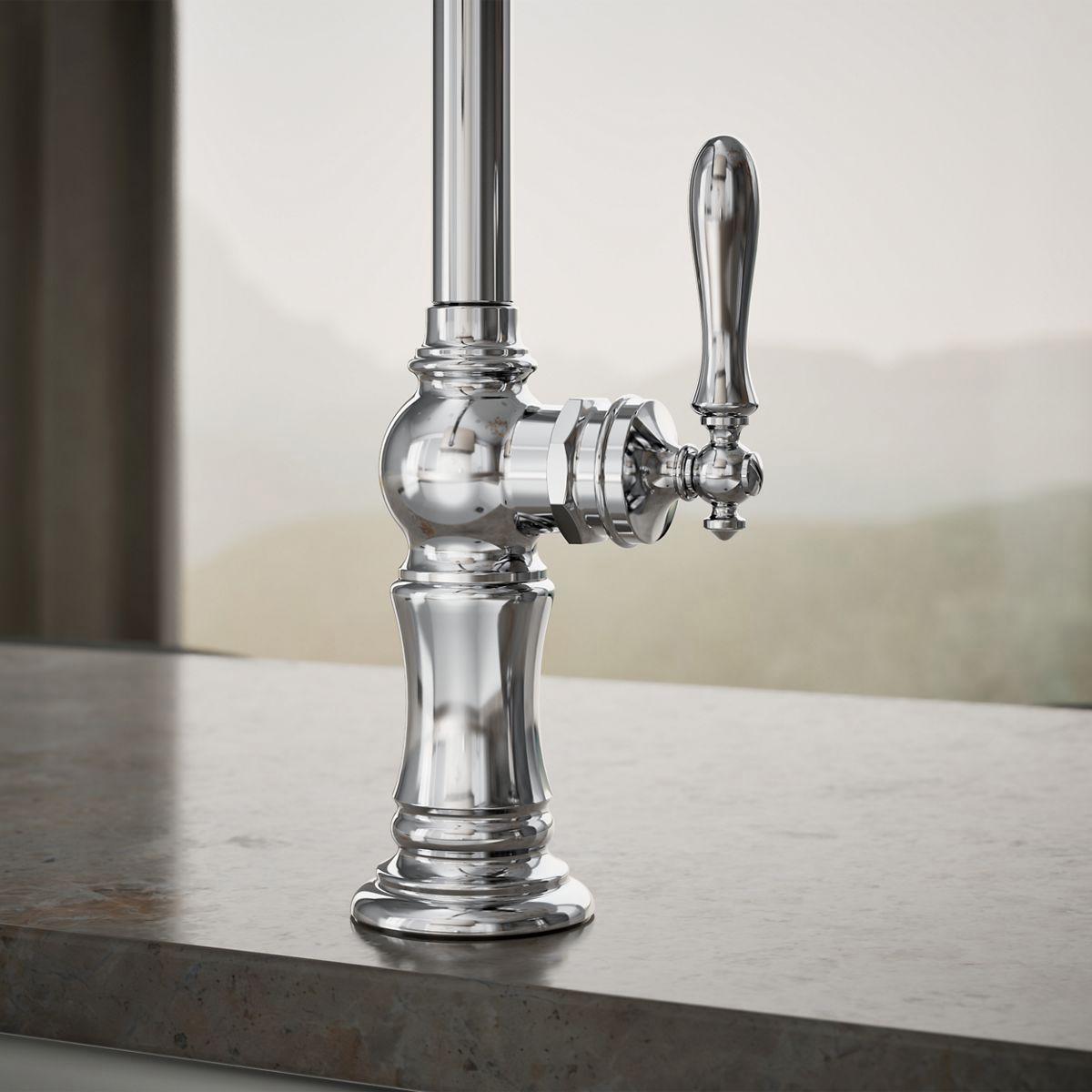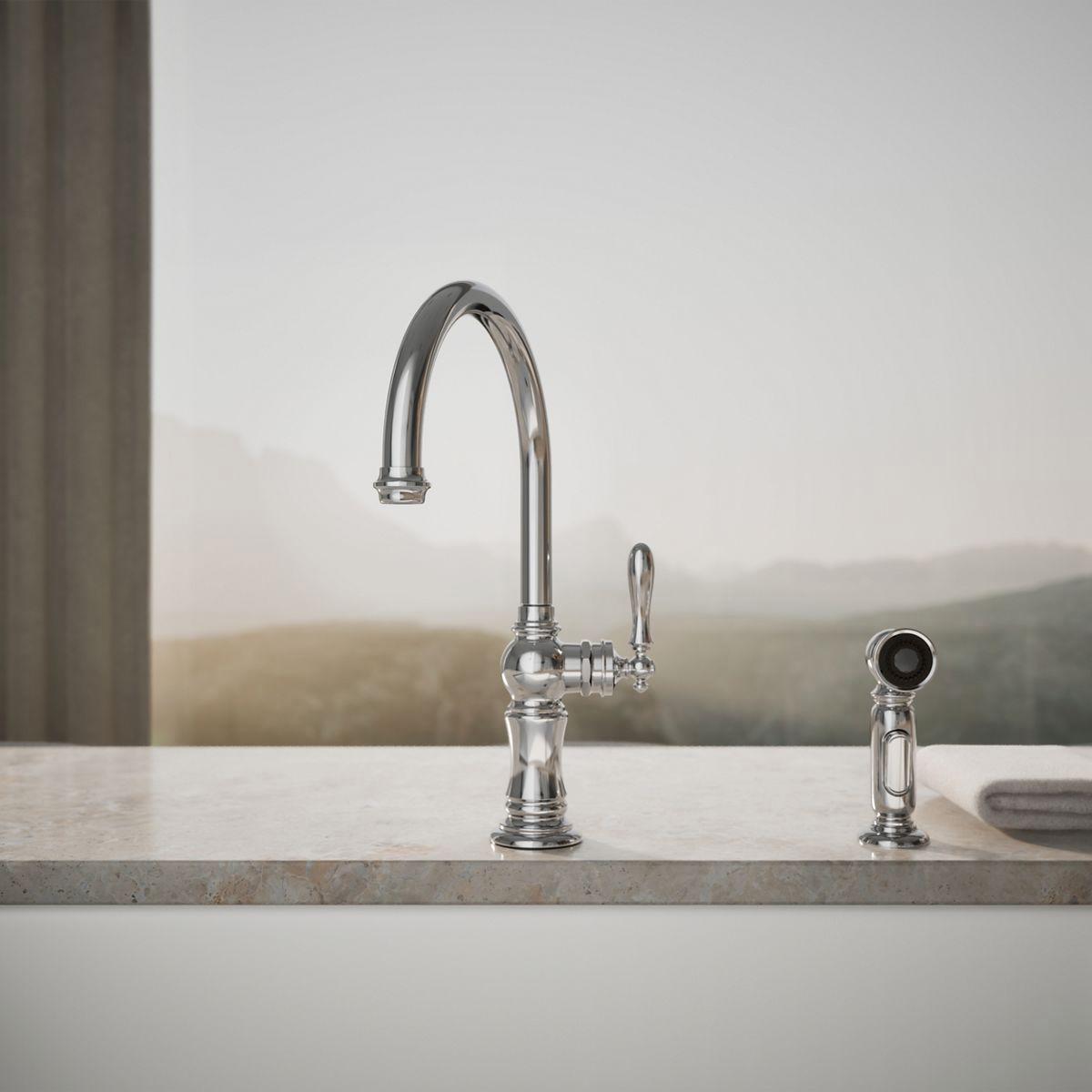 The Artifacts faucet collection brings you classic designs reimagined in fresh new ways for various task areas of the kitchen. This Artifacts kitchen sink faucet displays vintage style with its high-arch swing spout and turned lever handle. The matched two-function sidespray lets you switch between BerrySoft spray for food prep and Sweep spray for cleaning.