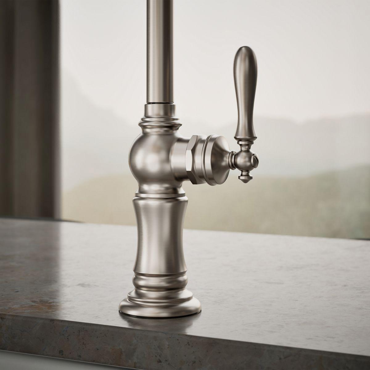 The Artifacts faucet collection brings you classic designs reimagined in fresh new ways for various task areas of the kitchen. This Artifacts kitchen sink faucet displays vintage style with its high-arch swing spout and turned lever handle. The matched two-function sidespray lets you switch between BerrySoft spray for food prep and Sweep spray for cleaning.