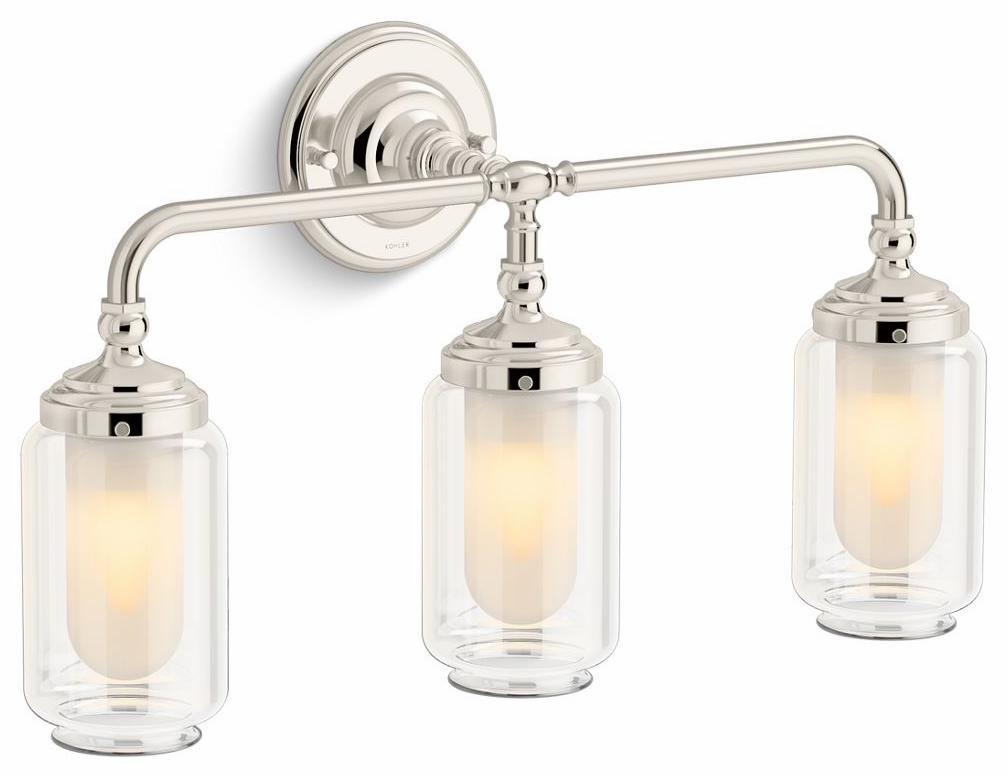 Timeless in its inspiration, the Artifactsbathroom collection combines quality craftsmanship with artisan designs to lend character and authenticity to your space. The 23" three-light wall sconce is an elegant complement to vintage-inspired decor. The fixture features three clear glass shades with inner frosted glass diffusers, subtle metal detailing, and rounded angles. Choose a finish that coordinates your entire room.