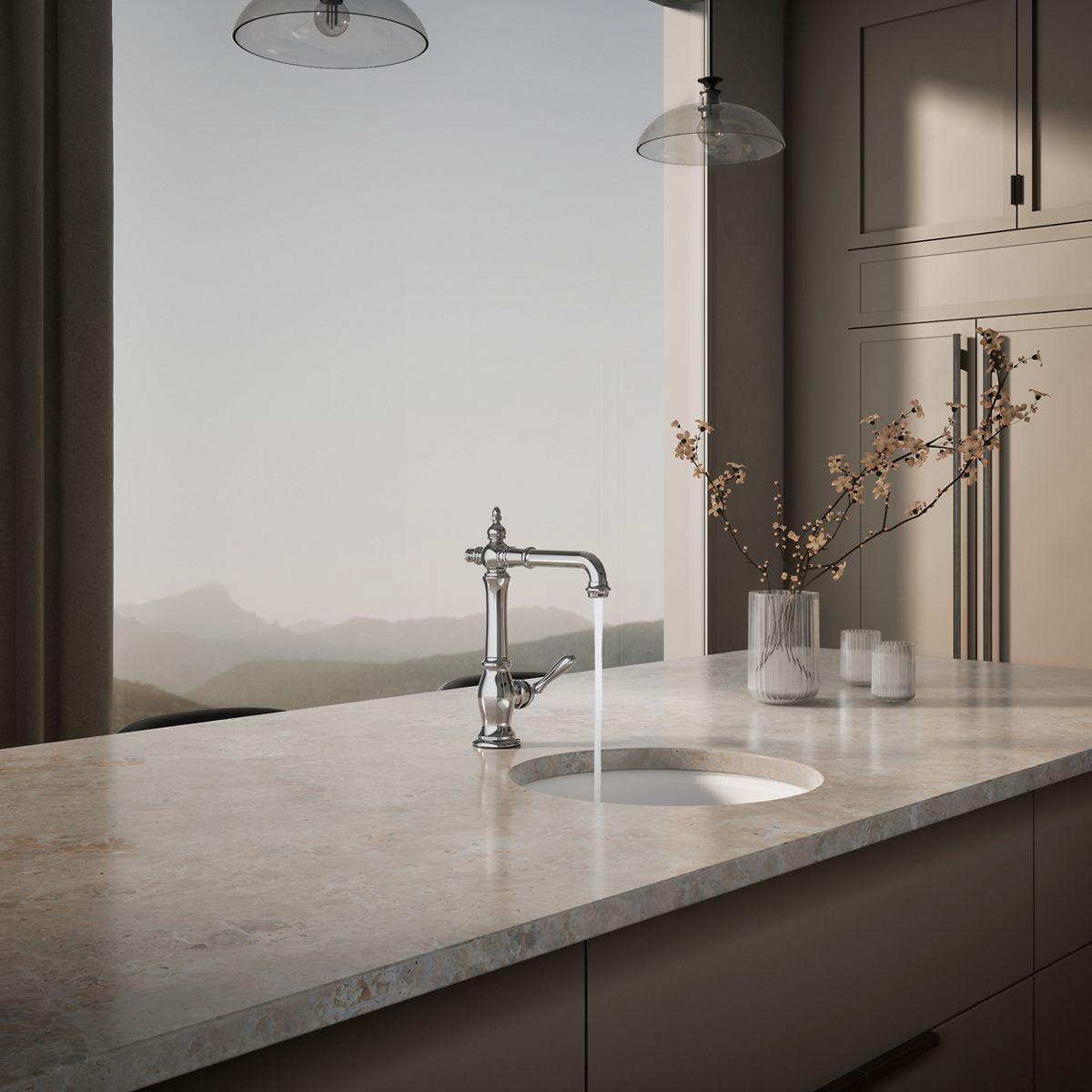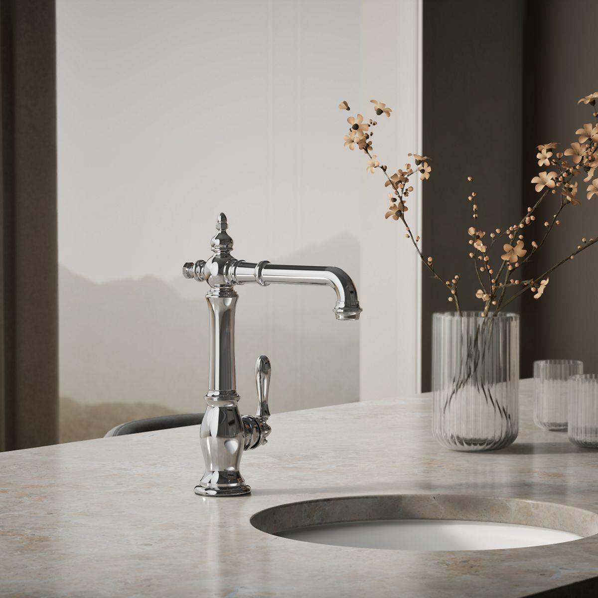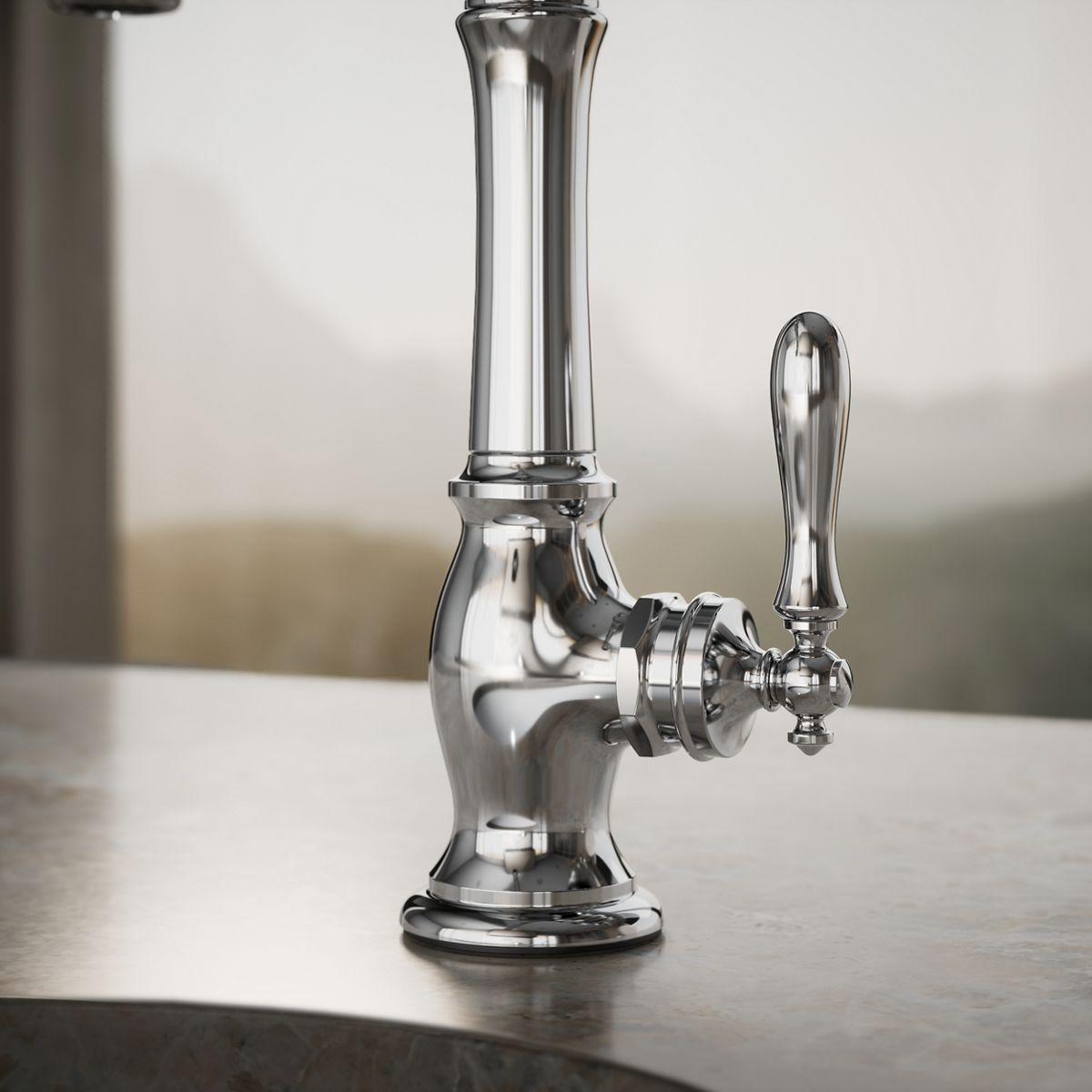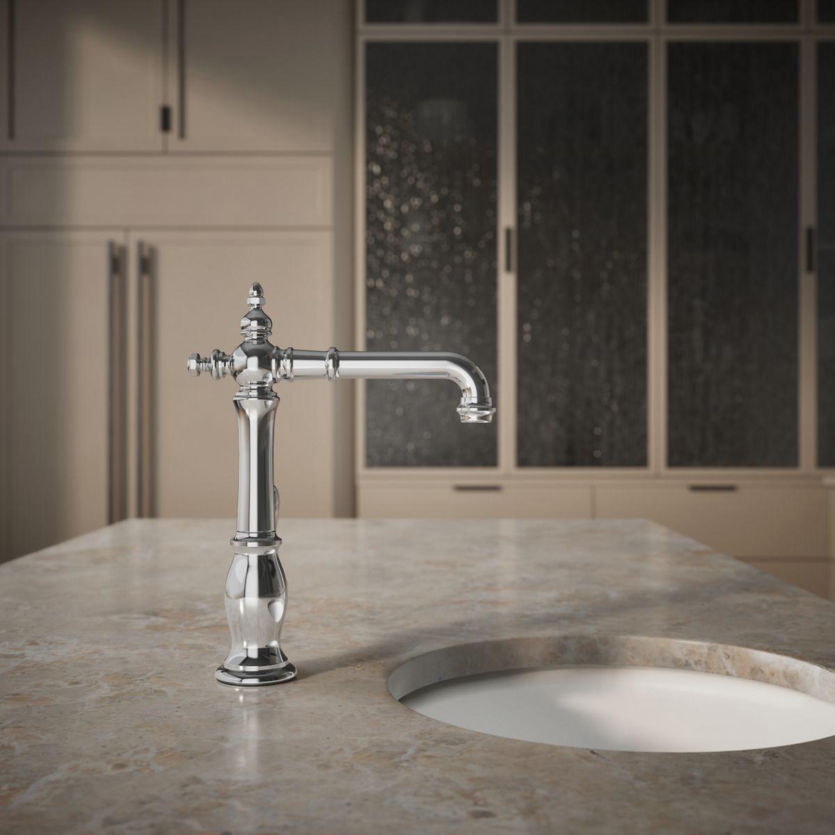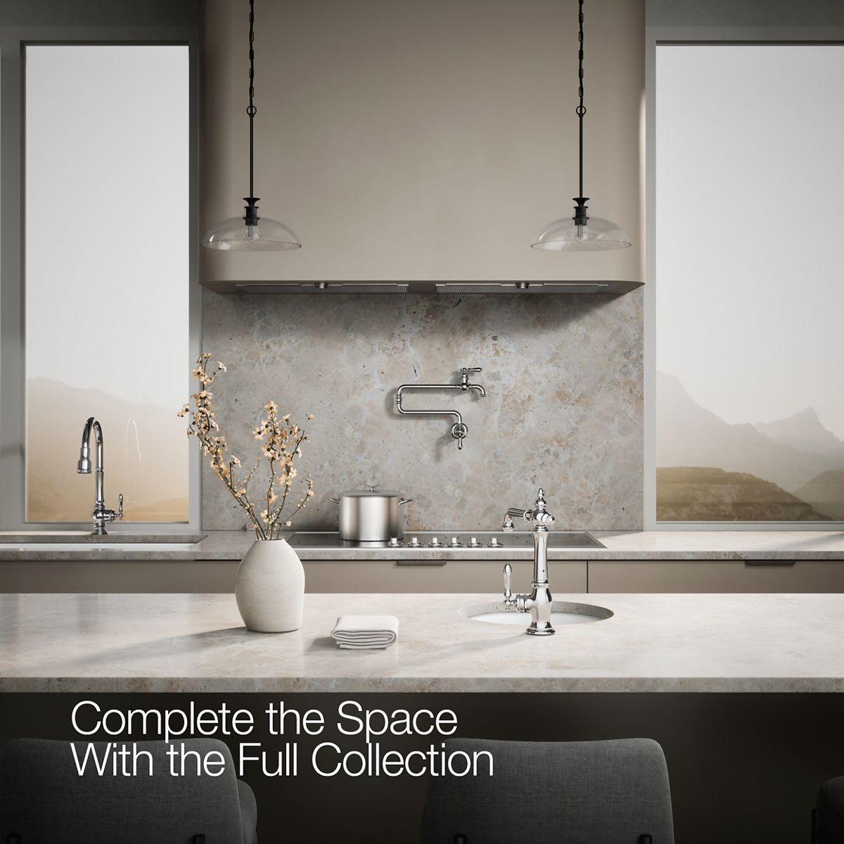 The Artifacts faucet collection brings you classic designs reimagined in fresh new ways for various task areas of the kitchen. This Victorian-inspired bar sink faucet features an elegant column design with convenient swing spout.